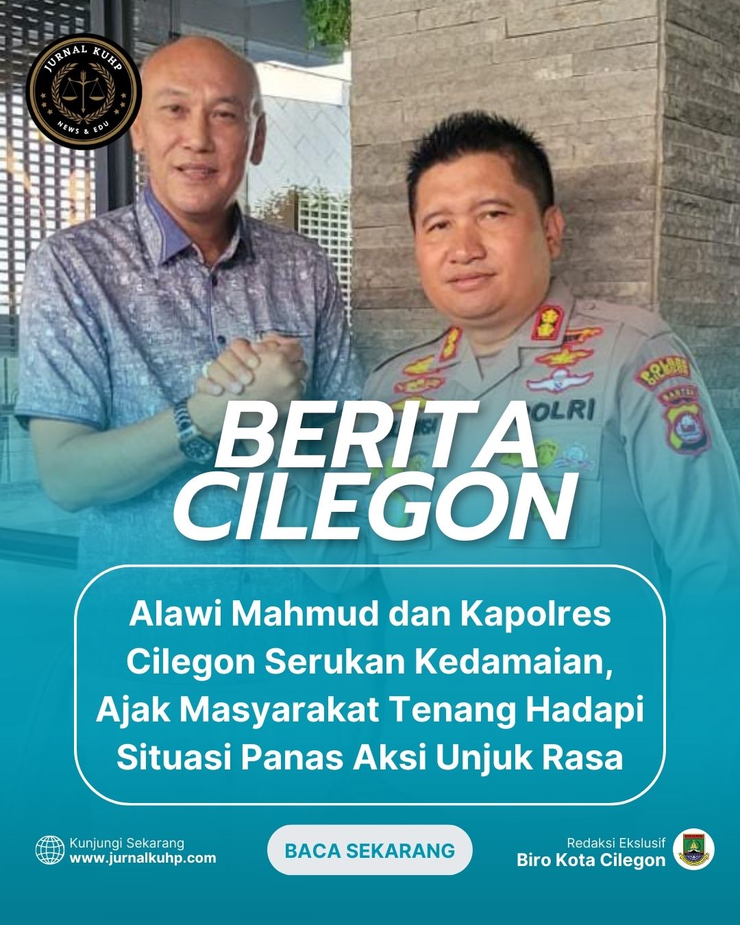CILEGON, JURNALKUHP.COM – Suhu politik dan sosial di tengah dinamika aksi unjuk rasa yang berpotensi anarkis mendapat perhatian serius dari tokoh politik dan aparat penegak hukum di Kota Cilegon. Ketua Dewan Pimpinan Daerah (DPD) Partai Amanat Nasional (PAN) Kota Cilegon, Alawi Mahmud, S.E., M.M, bersama Kapolres Cilegon, AKBP Dr. Martua Raja Taripar Laut Silitonga, S.H., S.I.K., M.Si, menyampaikan imbauan menyejukkan kepada masyarakat.