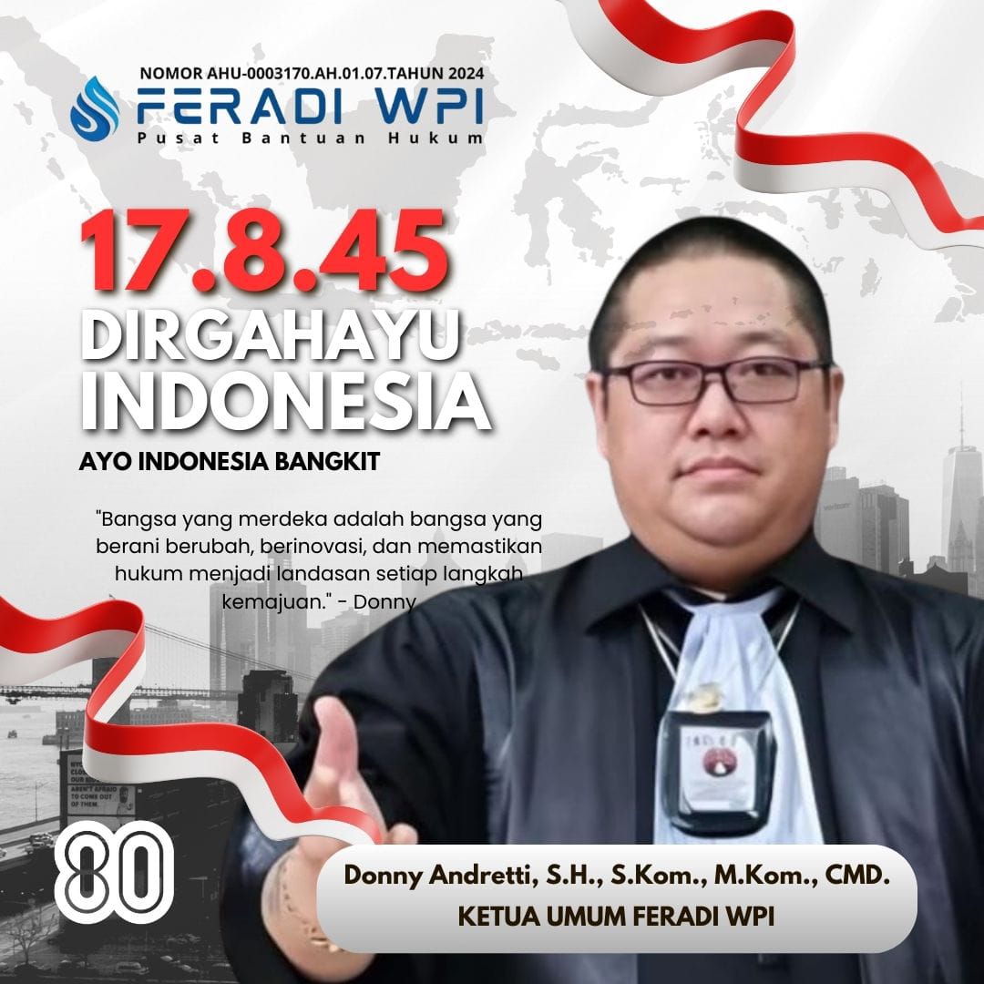 Ketua Umum FERADI WPI, Advokat Donny Andretti, S.H., S.Kom., M.Kom., CMD., menyatakan bahwa bangsa merdeka adalah bangsa yang mampu menata hukumnya sebagai fondasi kemajuan.