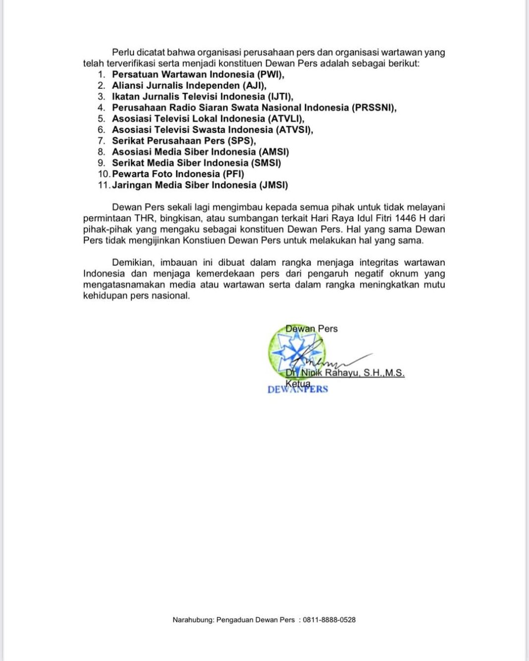 Dalam surat resmi bernomor 183/DP/K/III/2025, Dewan Pers menegaskan bahwa permintaan tersebut berpotensi menjadi praktik penipuan dan penyalahgunaan profesi wartawan. Oleh karena itu, semua pihak diharapkan menolak jika ada individu atau kelompok yang mengaku sebagai wartawan atau organisasi pers meminta sumbangan, bingkisan, atau THR.