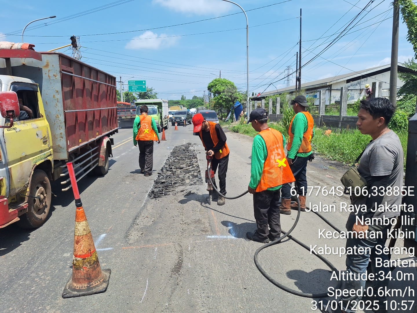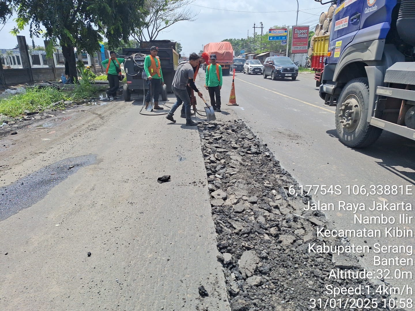 SERANG, JURNALKUHP.COM – Petugas Balai Pengawasan Jalan Nasional (BPJN) Banten memperbaiki jalan rusak disepanjang jalan nasional tepatnya di Desa Nambo Ilir dan Desa Julang, Kecamatan Cikande dan Kecamatan Kibin kabupaten Serang Banten, Jumat (31/01/2025).