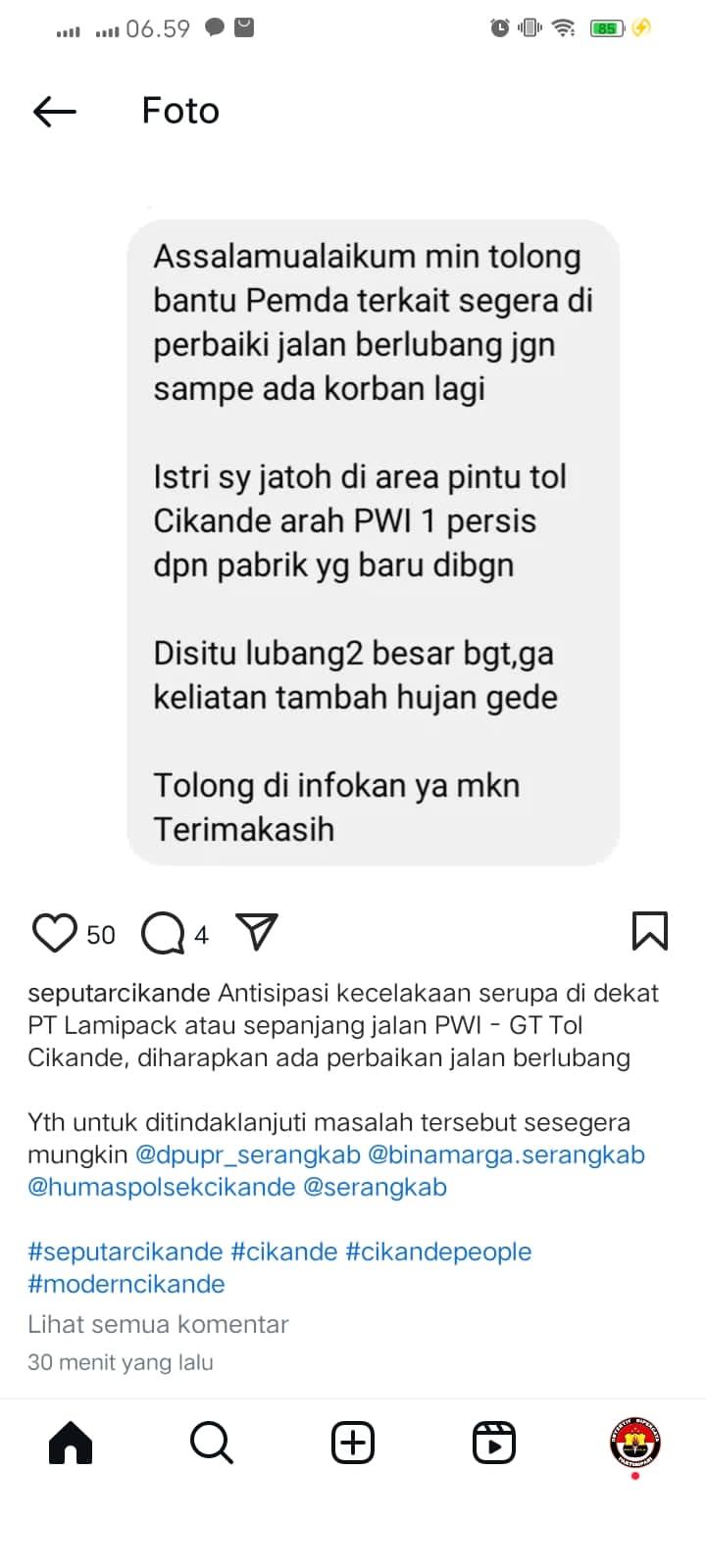 Perbaikan jalan rusak dilaksanakan setelah pihak BPJN mendapat laporan dari Kapolsek Cikande atas keluhan masyarakat yang disampaikan melalui media sosial maupun media online.