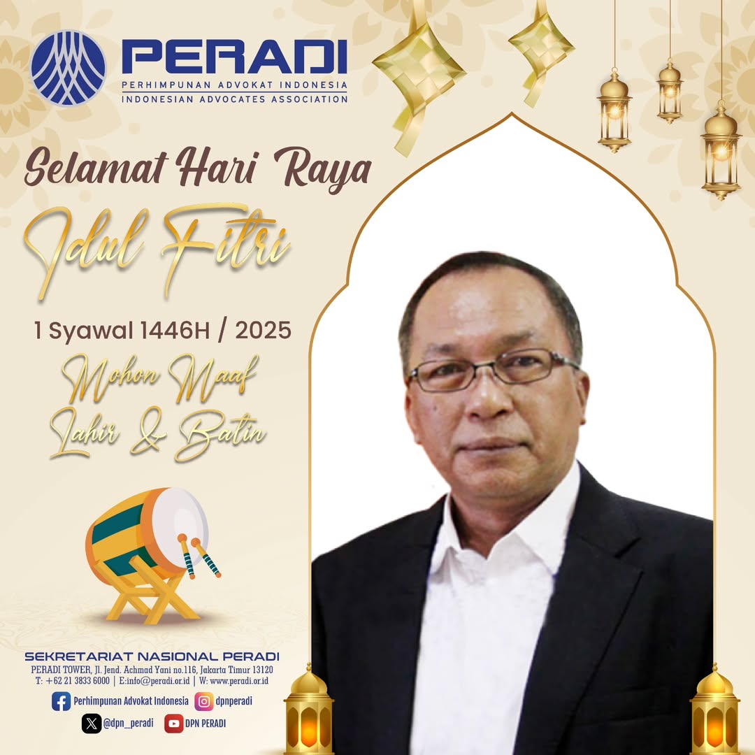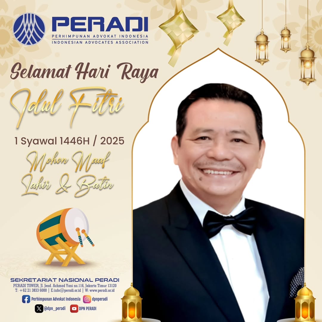 JAKARTA, JURNALKUHP.COM – Perhimpunan Advokat Indonesia (PERADI) menyampaikan ucapan Selamat Hari Raya Idul Fitri 1445 H kepada seluruh umat Muslim di Indonesia. Dalam momen penuh berkah ini, PERADI mengajak semua pihak untuk saling memaafkan dan mempererat tali silaturahmi.
