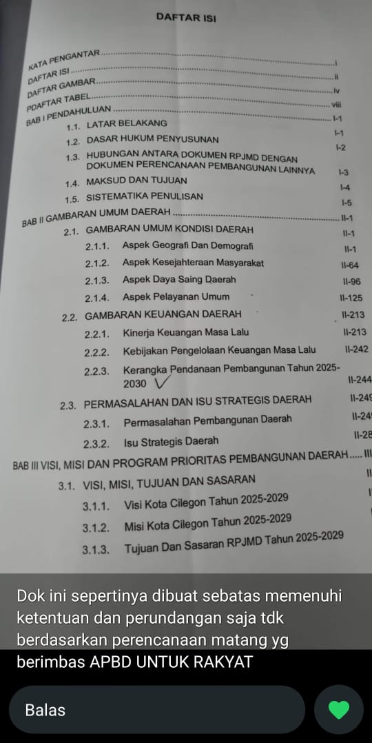 Sorotan dan kritik dari legislator PAN ini menegaskan bahwa dokumen perencanaan pembangunan tidak bisa disusun sekadar sebagai syarat administratif, melainkan harus menjawab tantangan dan kebutuhan masyarakat secara riil. Ia mendesak agar Pemerintah Kota Cilegon menyusun RPJMD secara serius, komprehensif, dan berdasarkan data faktual, agar APBD benar-benar berpihak pada rakyat.