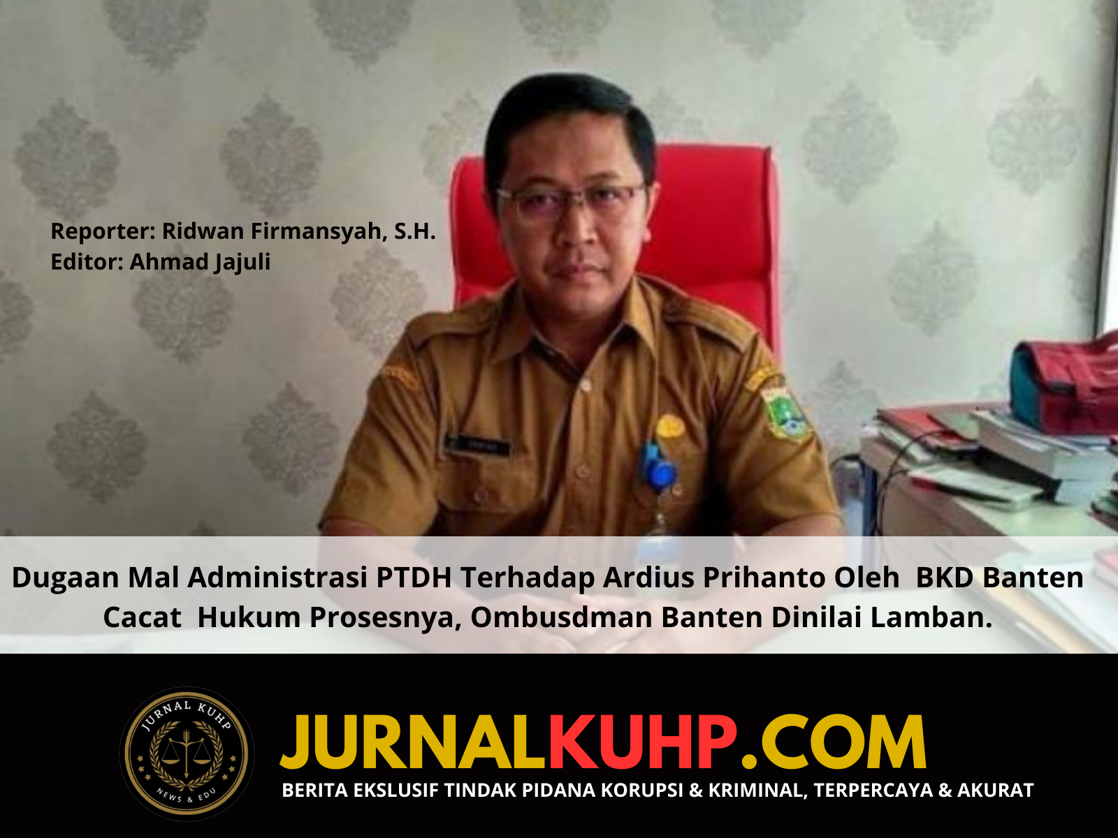 Laporan Ombudsman dengan kesalahan secara formal sehingga diduga PTDH atas nama Ardius Prihantono sebagai sekertaris dinas pendidikan Provinsi Banten cacat formil administrasi negara sehingga korban tidak menerima gaji sejak Pebruari 2023, hal tersebut di duga dilakukan oleh BKD Provinsi Banten dengan nomor surat PTDH 880.kep.06-BKD 2023 tanggal 31 januari 2023 dimana dalam putusan BKD Provinsi Banten tentang redaksi alasan dasar hukum konsideran putusan PTDH bahwa tercantum vonis terdakwa atau terpidana Ardius Prihantono putusan vonis 1 tahun 6 bulan dan denda Rp.300.000.000, sementara dalam amar putusan vonis perkara tipikor Nomor 15/Pid.Sus-TPK/2022/PN Srg dan eksekusi Kejaksaan nomor PRINT 3913/ M.6.10 Fu.08/2022 bahwa putusan vonis 1 tahun 4 bulan dengan denda Rp 100.000.000 serta putusan yang dikeluarkan PTDH oleh BKD Provinsi Banten didasari oleh putusan Mahkamah Agung padahal Pengadilan Negeri Tipikor Serang bukan Mahkamah Agung menyebabkan cacat administrasif dan tidak mempunyai kekuatan hukum dalam PTDH yang menghentikan hak korban dalam menerima gaji sebagai PNS , dalam suratnya korban Ardius Prihantono melalui YLBH Garuda Emas Perkasa telah mengirimkan keberatan baik ke bagian disipilin secara lisan maupun tertulis secara langsung dan upaya hukum ke pimpinan atasan langsung yaitu Kepala BKD Provinsi Banten tembusan ke atasan pimpinan PJ Gubernur Provinsi Banten tidak menemukan keadilan dalam cerita yang di alami korban baik moril maupun materil, sehingga korban melalui YLBH Garuda Emas Perkasa, Asep SH salah satu anggota melaporkan dugaan mal administratif tersebut ke Ombudsman RI dan di delegasikan ke Ombudsman perwakilan Banten, menurut anggota YLBH Garuda Emas Perkasa, Asep, SH salah satu anggota kepada media Jurnal KUHP pada Jum’at 13 September 2024 .