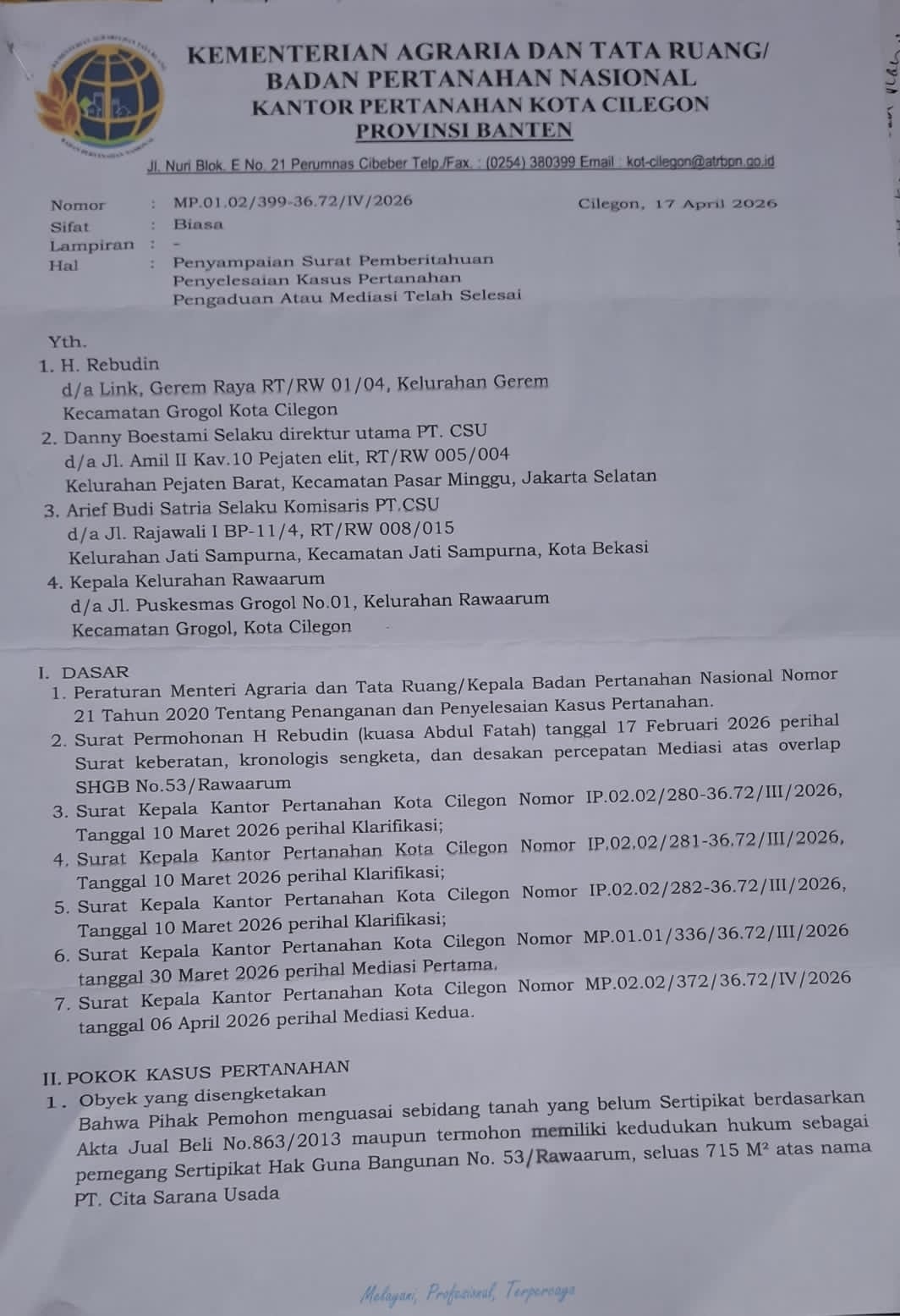 Mengacu pada dokumen resmi Kantor Pertanahan Kota Cilegon tertanggal 17 April 2026, proses penanganan sengketa telah melalui beberapa tahapan, mulai dari klarifikasi hingga dua kali mediasi.