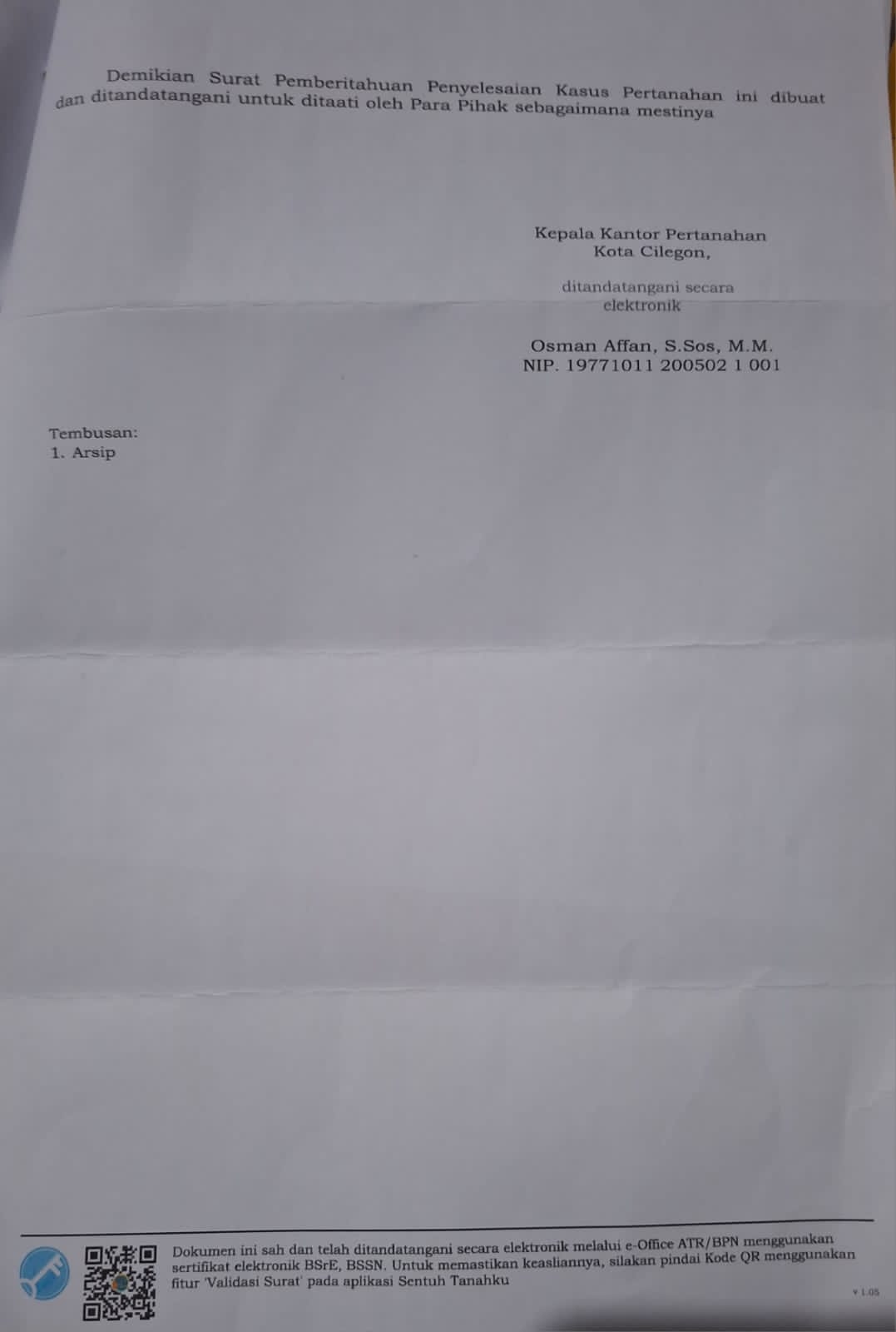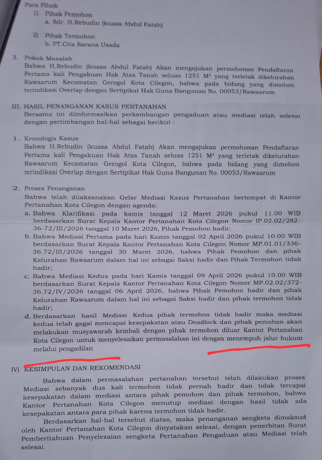 Dalam surat pemberitahuan penyelesaian kasus pertanahan, Kantor Pertanahan Kota Cilegon menyimpulkan bahwa proses mediasi telah selesai dilaksanakan, namun tidak mencapai kesepakatan antara para pihak.