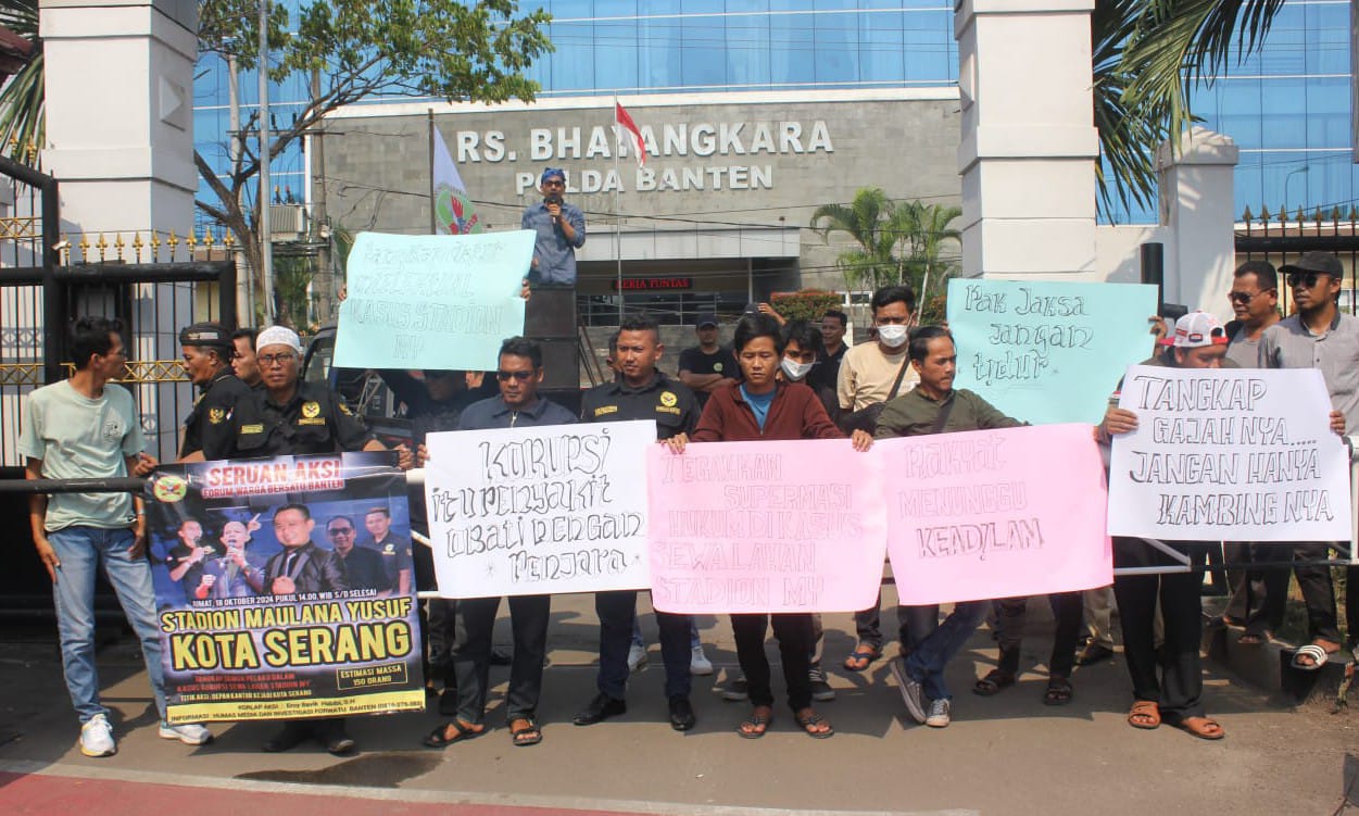 Berdasarkan pantauan awak media dilokasi sekira pukul 13.000 WIB, massa Forwatu Banten memasang spanduk bertuliskan “Tangkap Semua Pelaku Dalam Kasus Korupsi Sewa Lahan Stadion MY”. Kemudian mereka juga membentangkan kertas karton bertuliskan “Korupsi Itu Penyakit Obati Dengan Penjara” dan “Tegakan Supremasi Hukum Di Kasus Sewa Lahan Stadion MY”.