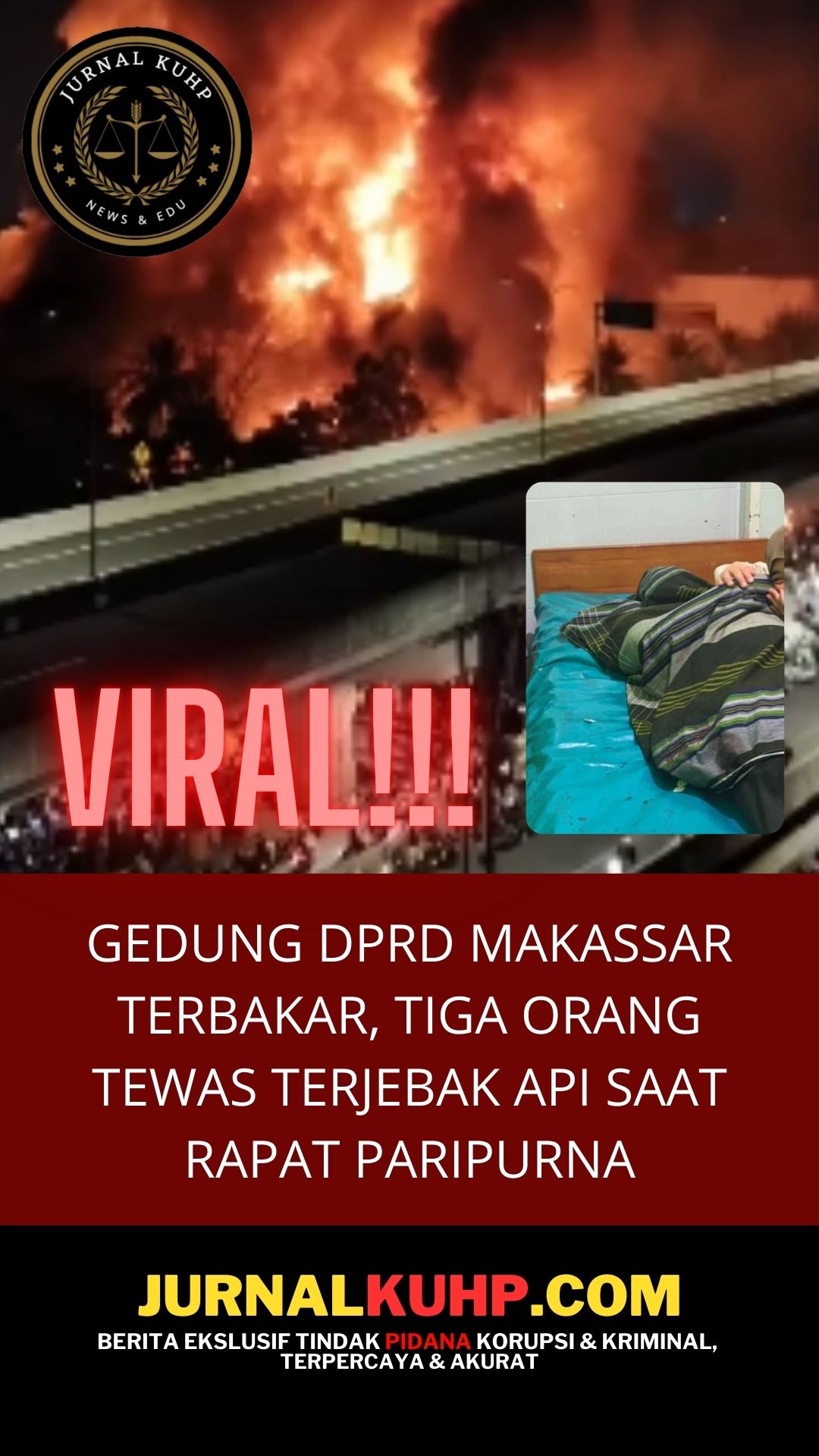 MAKASSAR, JURNALKUHP.COM – Jumlah korban jiwa dalam tragedi kebakaran gedung DPRD Kota Makassar, Jumat malam (29/8/2025), bertambah menjadi tiga orang. Tim gabungan berhasil mengevakuasi dua jenazah tambahan, yakni Sarinawati (25) dan Akbar (27), yang ditemukan dalam kondisi meninggal dunia di dalam gedung.