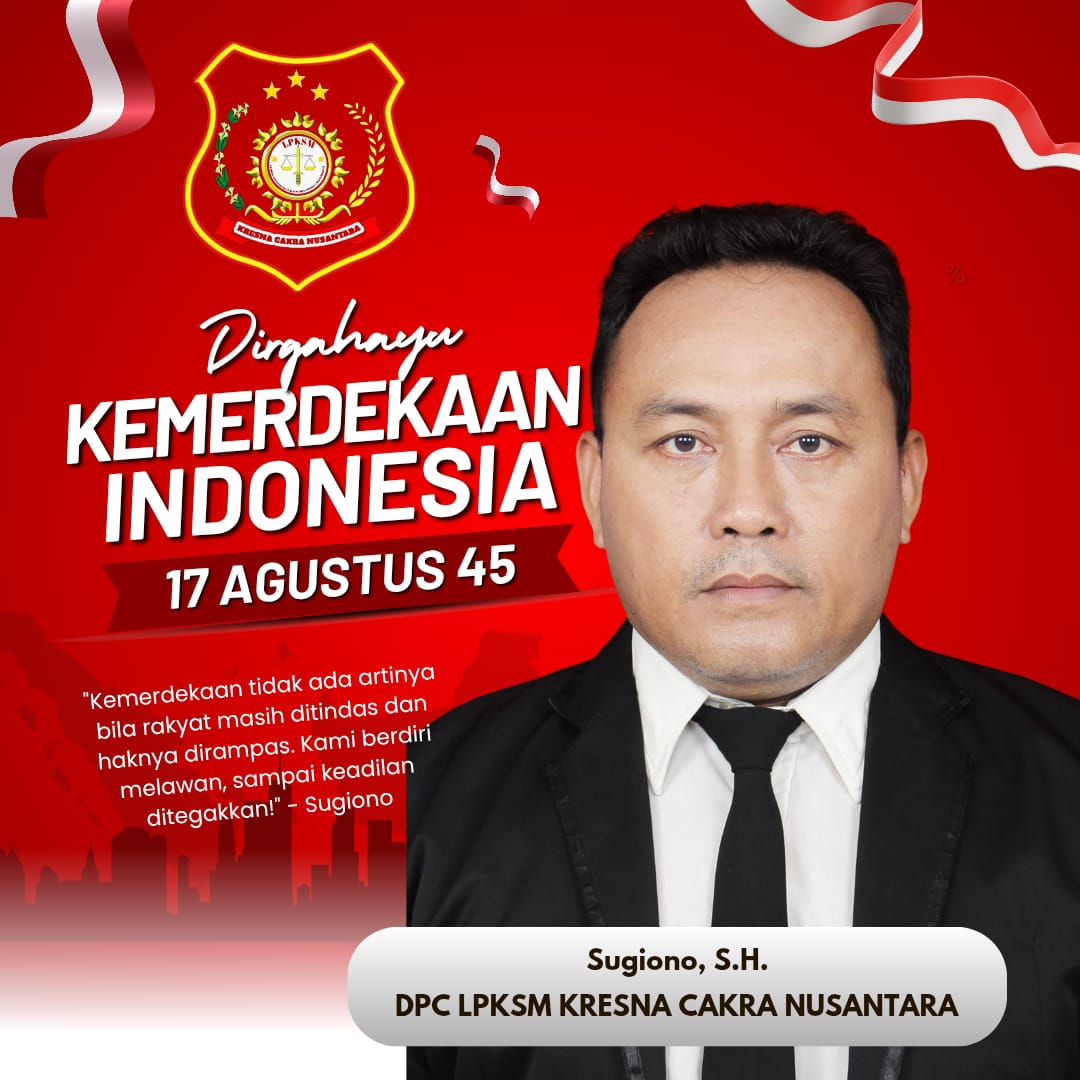 KEBUMEN, JURNALKUHP.COM – Kemerdekaan Indonesia yang ke-80 seharusnya menjadi ruang refleksi bersama: apakah bangsa ini sudah benar-benar merdeka atau masih terikat pada belenggu ketidakadilan? Bagi Sugiono, S.H., dari DPC LPKSM Kresna Cakra Nusantara, nasionalisme tidak cukup hanya dengan upacara, bendera, dan seremonial.