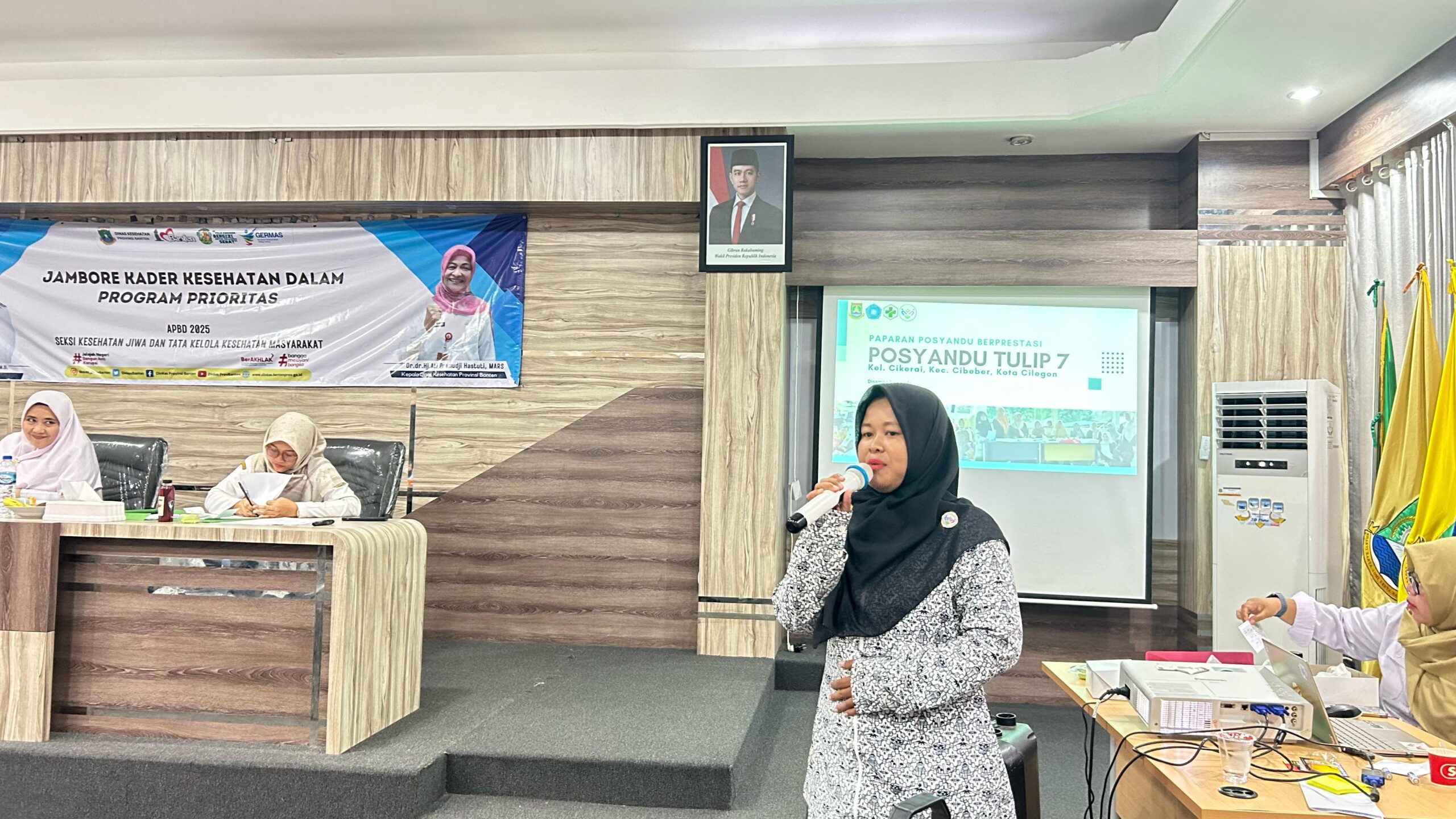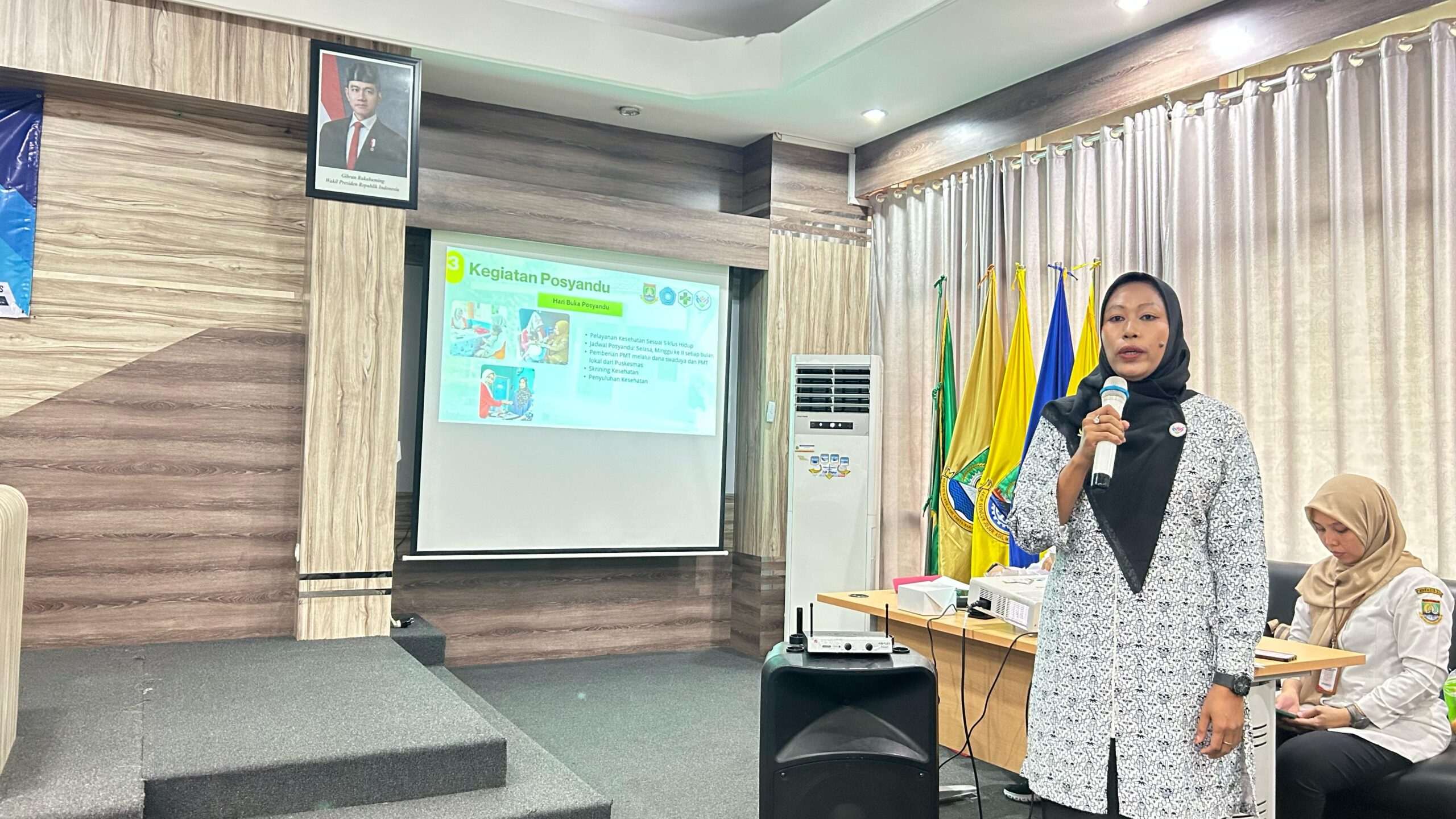 Titi Alfiati dari Posyandu Aster 6, Kelurahan Bendungan, Kecamatan Cilegon, mengikuti kategori kader berprestasi dengan presentasi tentang integrasi edukasi stunting dalam kegiatan bulanan posyandu.