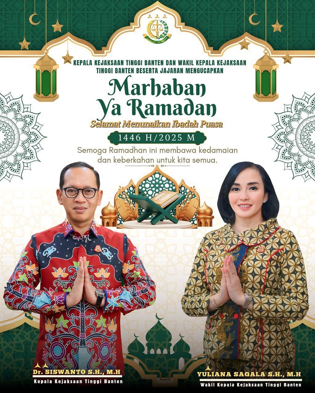 SERANG, JURNALKUHP.COM – Kepala Kejaksaan Tinggi (Kajati) Banten, Dr. Siswanto, S.H., M.H., bersama Wakil Kepala Kejaksaan Tinggi (Wakajati) Banten, Yuliana Sagala, S.H., M.H., serta seluruh jajaran Kejati Banten menyampaikan ucapan selamat menunaikan ibadah puasa di bulan suci Ramadhan 1446 H / 2025 M kepada seluruh umat Muslim, khususnya masyarakat Banten.