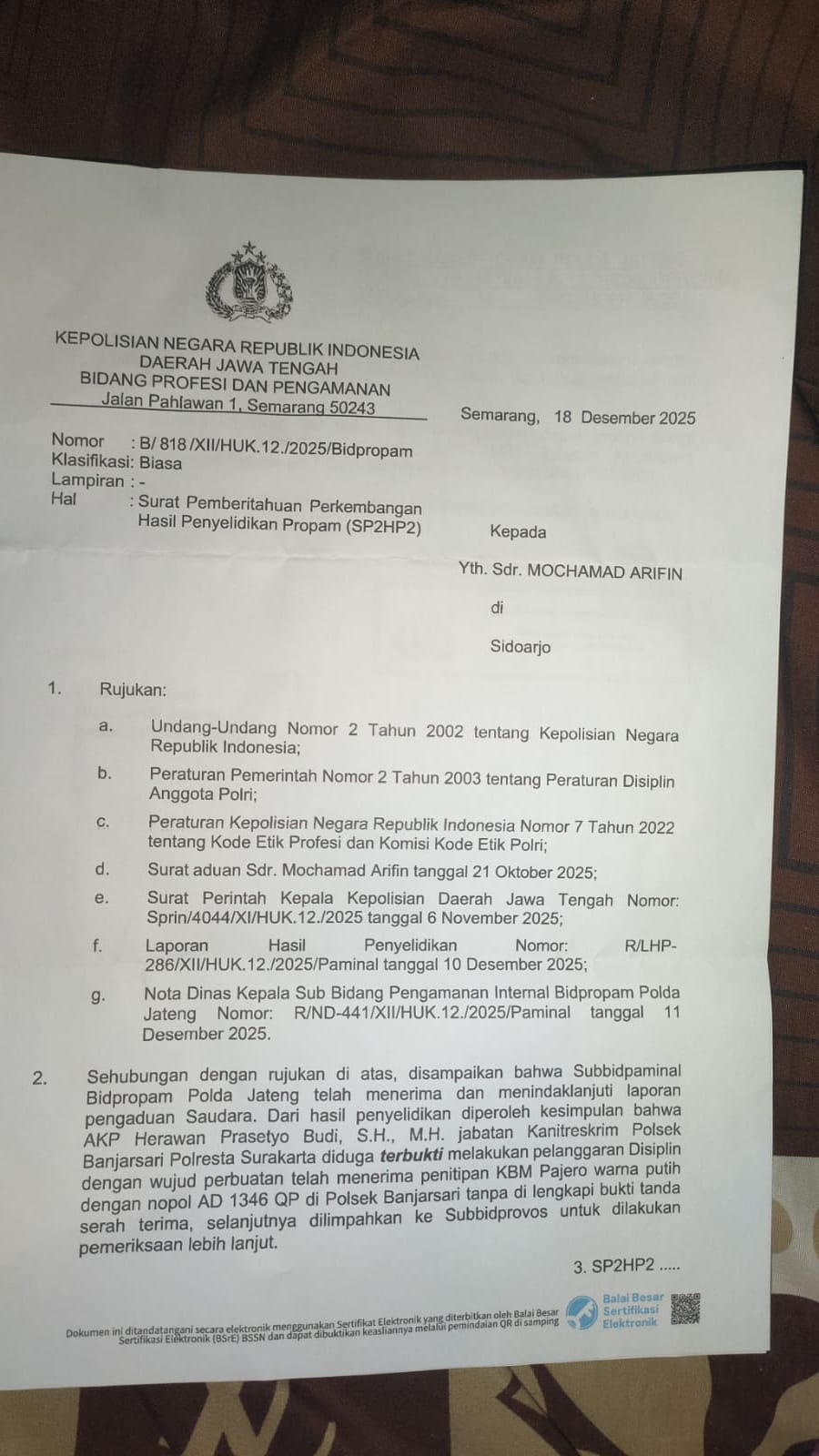 SP2HP2 Nomor B/818/XII/HUK.12./2025/Bidpropam tersebut ditujukan kepada kuasa hukum pelapor, Mochamad Arifin. Dalam hasil penyelidikan internal, Bidpropam menyatakan bahwa AKP Herawan Prasetyo Budi, S.H., M.H., Kanit Reskrim Polsek Banjarsari Polresta Surakarta, diduga terbukti bersalah berkaitan penitipan kendaraan Mitsubishi Pajero AD 1346 QP tanpa bukti tanda serah terima resmi. Perkara selanjutnya dilimpahkan ke Subbidprovos untuk pemeriksaan lanjutan.