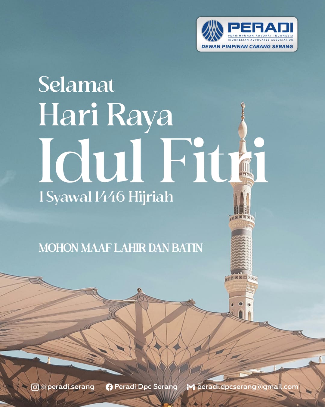 SERANG, JURNALKUHP.COM – Dalam suasana penuh kegembiraan dan kebahagiaan, Dewan Pimpinan Cabang (DPC) Perhimpunan Advokat Indonesia (Peradi) Serang mengucapkan Selamat Hari Raya Idul Fitri 1 Syawal 1446 H kepada ambah kepada masyarakat umumnya dan anggota Peradi khususnya. Dengan penuh ketulusan, mereka menyampaikan Mohon Maaf Lahir dan Batin, sebagai wujud rasa syukur atas datangnya hari kemenangan setelah menjalani ibadah Ramadan.