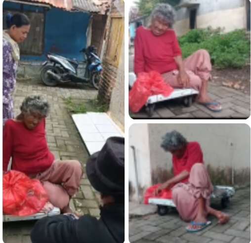 nenek tersebut bernama ; emun yang akrab di sapa setiap harinya tinggal berdua di rumah kumuh yang cukup tidak layak huni dengan kondisi bagian tembok rumah sudah rusak , pintu rumah juga sudah rusak dan yang lebih miris lagi kondisi bagian atap rumah sudah tidak ada, nenek emun dapat berjalan kaki hanya menggunakan sebuah kecil roda terbuat dari papan berbahan dasar papan bekas.