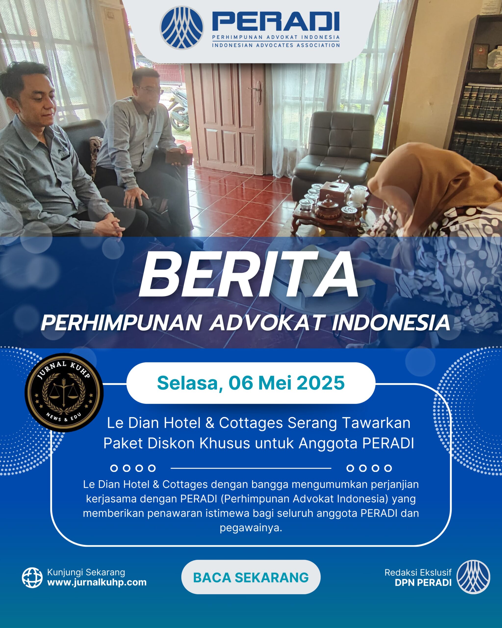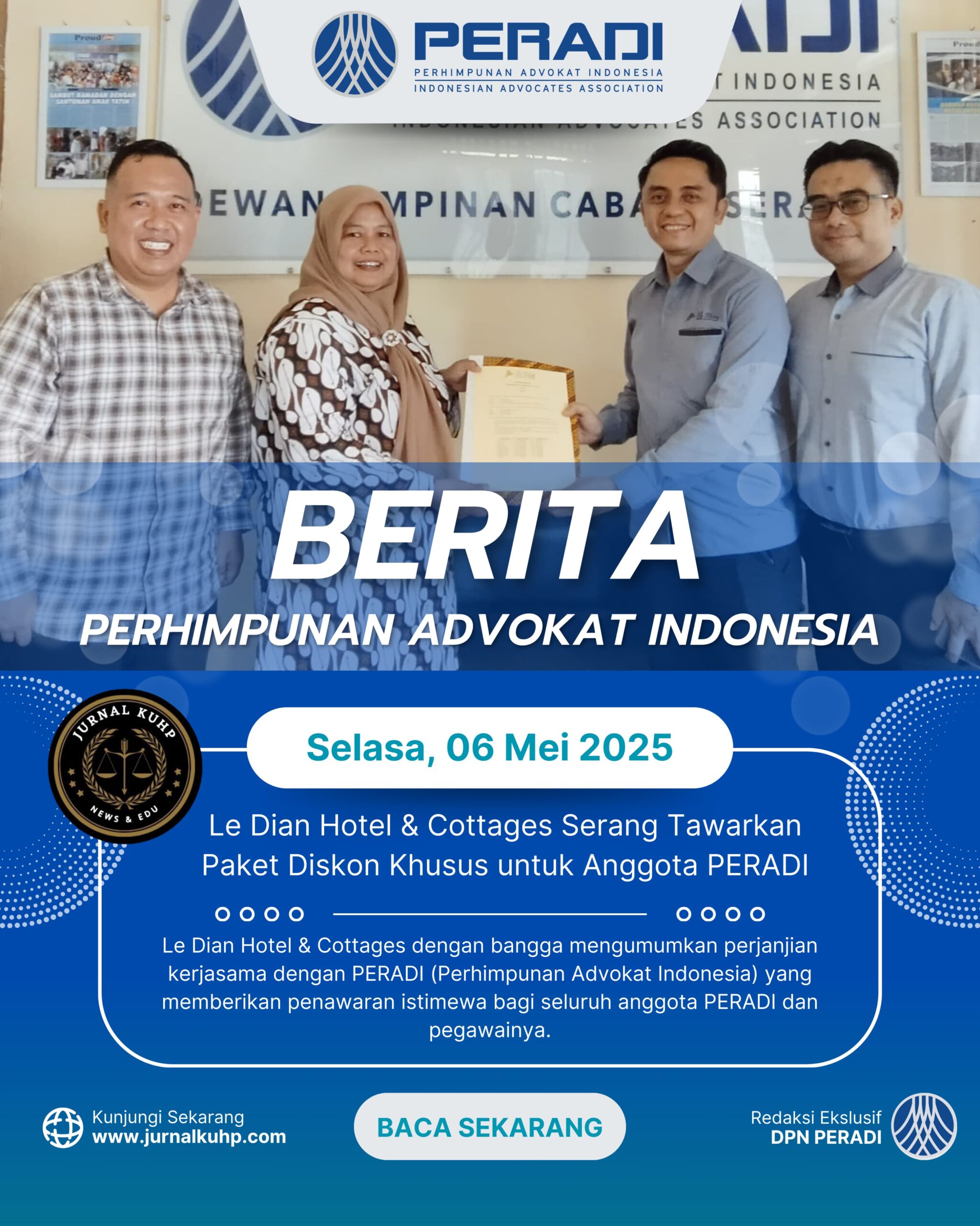 SERANG, JURNALKUHP.COM – Le Dian Hotel & Cottages dengan bangga mengumumkan perjanjian kerja sama dengan PERADI (Perhimpunan Advokat Indonesia), yang menghadirkan penawaran eksklusif bagi seluruh anggota dan pegawai PERADI. Dalam wawancara eksklusif bersama Redaksi JURNALKUHP.COM, Ketua DPC PERADI Serang, Shanty Wildhaniyah, S.H., M.H., menyatakan bahwa kerja sama ini merupakan langkah strategis untuk memberikan manfaat nyata, khususnya dalam mendukung kebutuhan akomodasi dan fasilitas anggota, baik untuk keperluan profesional maupun pribadi, Selasa (06/05/2025).