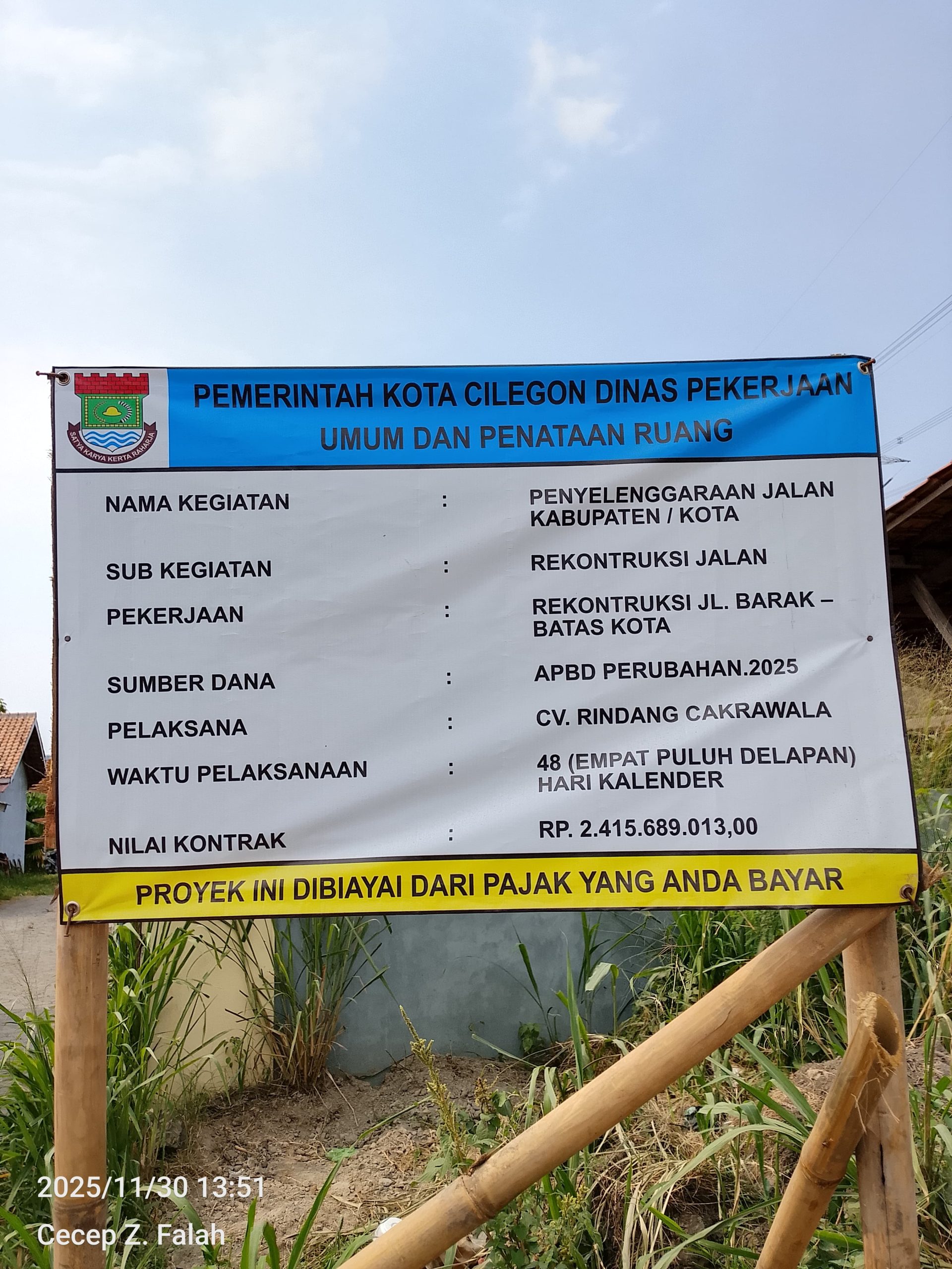 Pada papan proyek, simbol resmi Pemerintah Kota Cilegon yang seharusnya menjadi identitas legal proyek negara justru diganti dengan logo lain yang belum diketahui dasar hukumnya. Proyek dengan nilai Rp 2.415.689.013,00 itu dikerjakan oleh pelaksana CV Rindang Cakrawala.