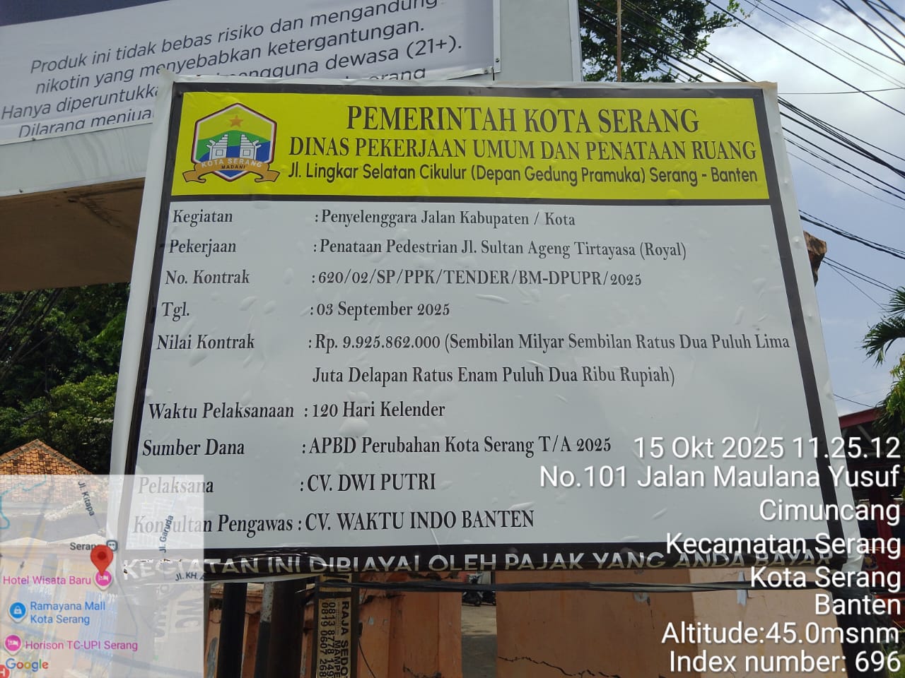 Proyek tersebut diketahui merupakan Pekerjaan Penataan Pedestrian Jalan Sultan Ageng Tirtayasa (Royal) dengan Nomor Kontrak: 620/02/SP/PPK/TENDER/BM-DPUPR/2025, bersumber dari APBD Perubahan Kota Serang Tahun Anggaran 2025, dengan pagu anggaran sebesar Rp9,9 miliar lebih.