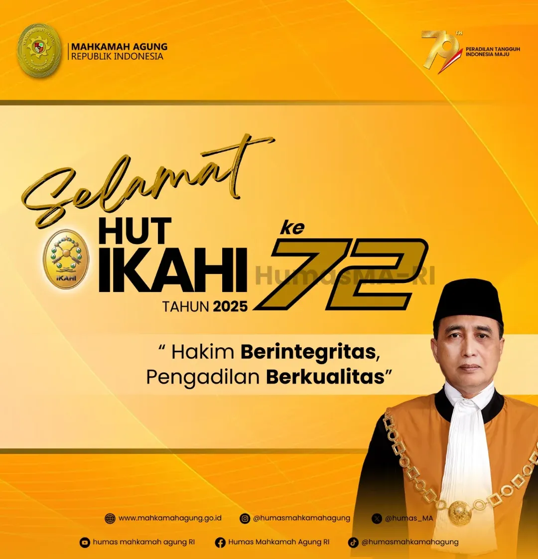 JAKARTA, JURNALKUHP.COM – Dalam rangka memperingati Hari Ulang Tahun ke-72 Ikatan Hakim Indonesia (IKAHI) tahun 2025, Mahkamah Agung Republik Indonesia menyampaikan ucapan selamat dan harapan besar terhadap peningkatan integritas serta kualitas lembaga peradilan di Tanah Air.
