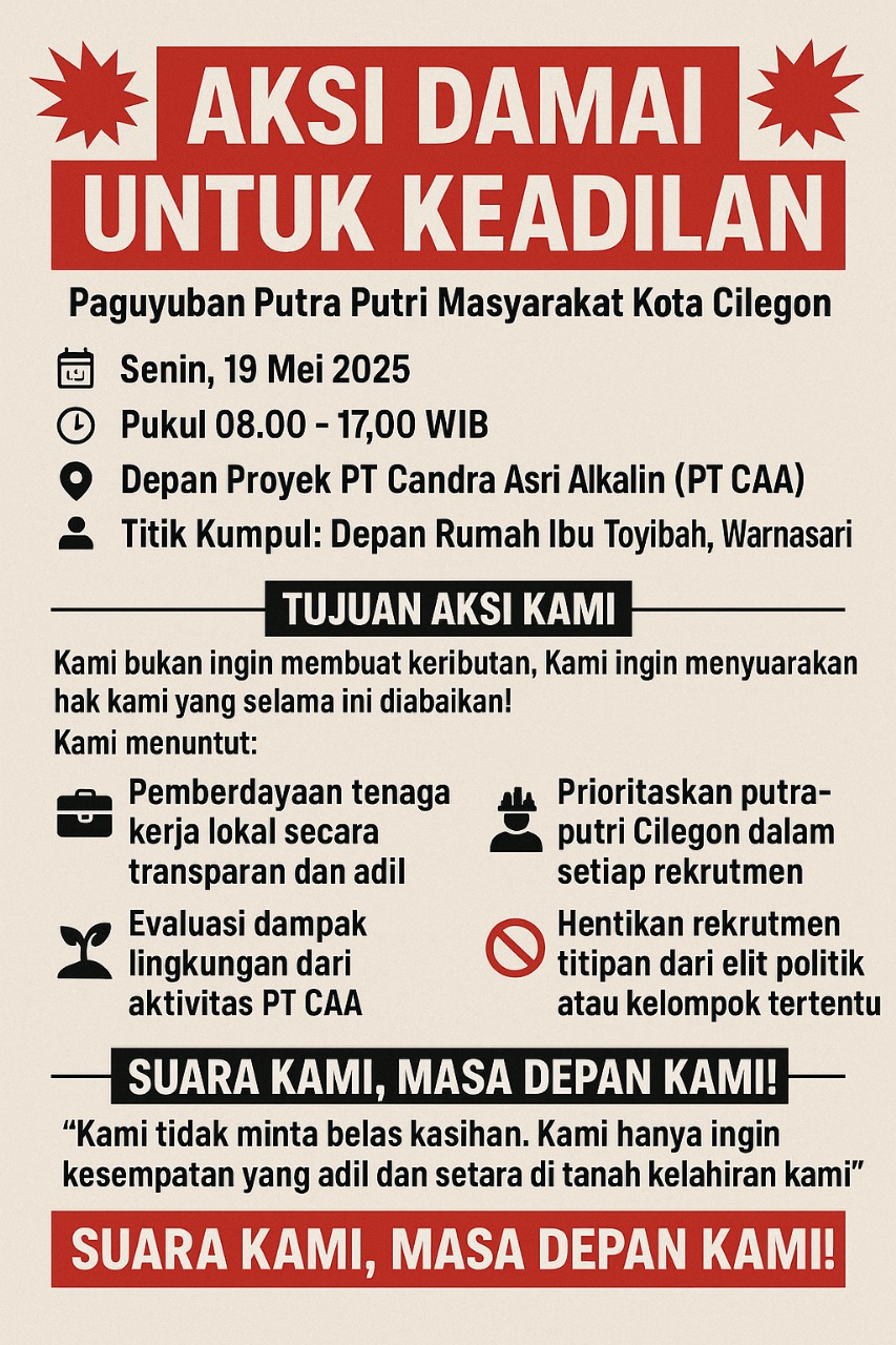 CILEGON, JURNALKUHP.COM – Masyarakat Kota Cilegon akan menggelar aksi damai pada Senin, 19 Mei 2025, sebagai bentuk tuntutan keadilan dalam proses perekrutan tenaga kerja pada proyek-proyek besar yang ada di wilayah tersebut. Aksi ini akan berlangsung dari pukul 08.00 hingga 17.00 WIB di depan proyek PT Candra Asri Alkalin (PT CAA), yang berlokasi di Cilegon. Aksi damai ini diorganisir oleh Paguyuban Putra Putri Masyarakat Kota Cilegon dengan tujuan untuk mengedepankan kepentingan masyarakat lokal dalam sektor ketenagakerjaan.