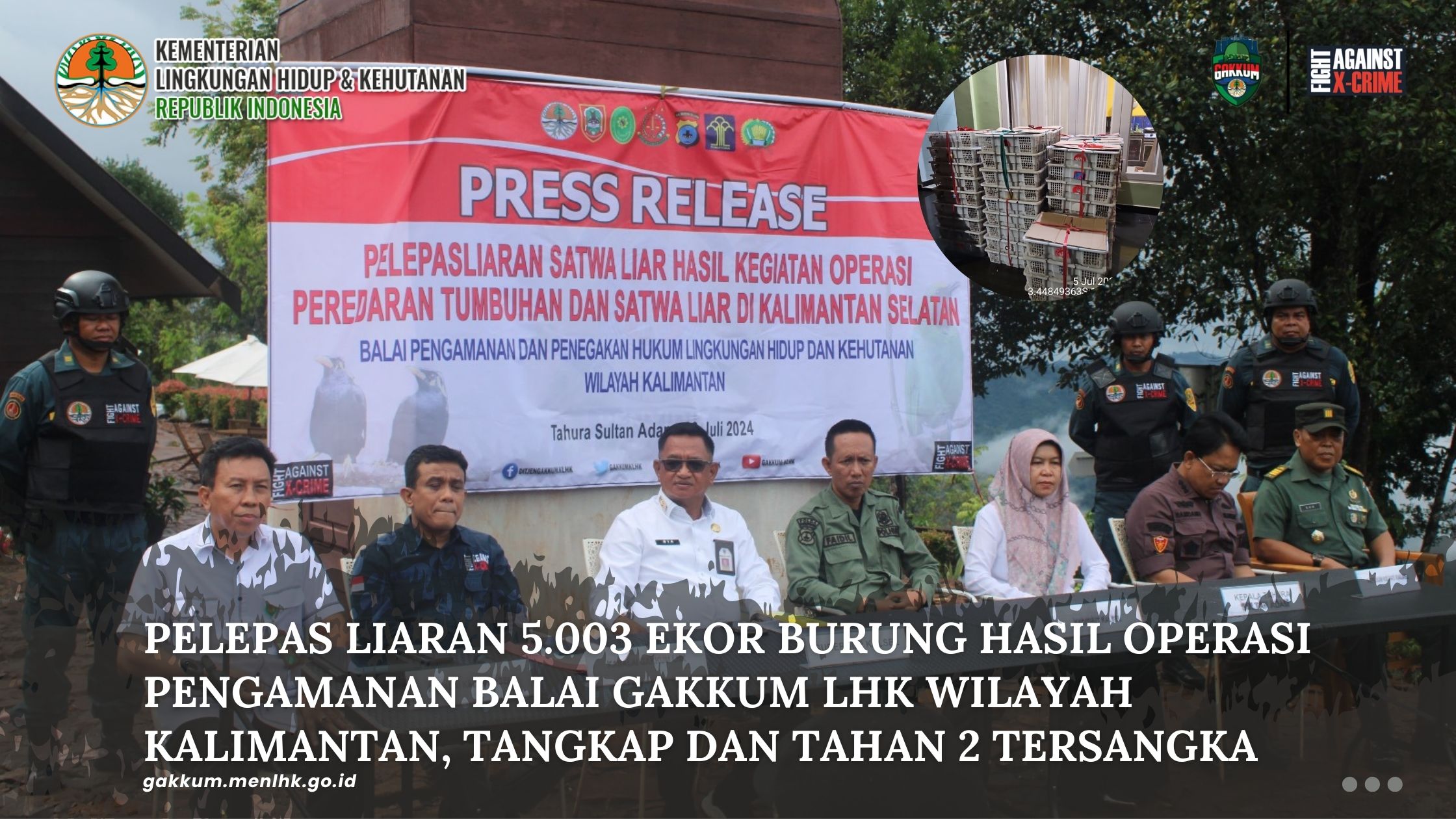 Banjarbaru, Balai Gakkum LHK Wilayah Kalimantan Seksi Wilayah I Palangka Raya berhasil menggagalkan pengangkutan 5.003 ekor burung di sekitar wilayah Kabupaten Banjar pada hari Jumat tanggal 5 Juli 2024. Sebanyak 837 ekor diantaranya adalah jenis – jenis burung yang dikategorikan sebagai satwa dilindungi. Burung – burung yang diamankan dari kegiatan pengangkutan tersebut adalah jenis burung yang dilindungi yaitu : Beo (Gracula religiosa), Cililin (Platylophus galericulatus), Serindit (Loriculus galgulus), Cucak Hijau (Chloropsis sonnerati), serta jenis yang tidak dilindungi yaitu : Kolibri Ninja (Leptocoma spirata), Madu Kelapa (Anthreptes malacensis), Kacer (Copsychus saularis), Murai (Kittacincla malabarica), Kacamata Belukar (Zopterops auriventer), dan Kapas Tembak (Pycronotus plumosus) yang hanya dapat diedarkan berdasarkan izin dari pejabat berwenang.