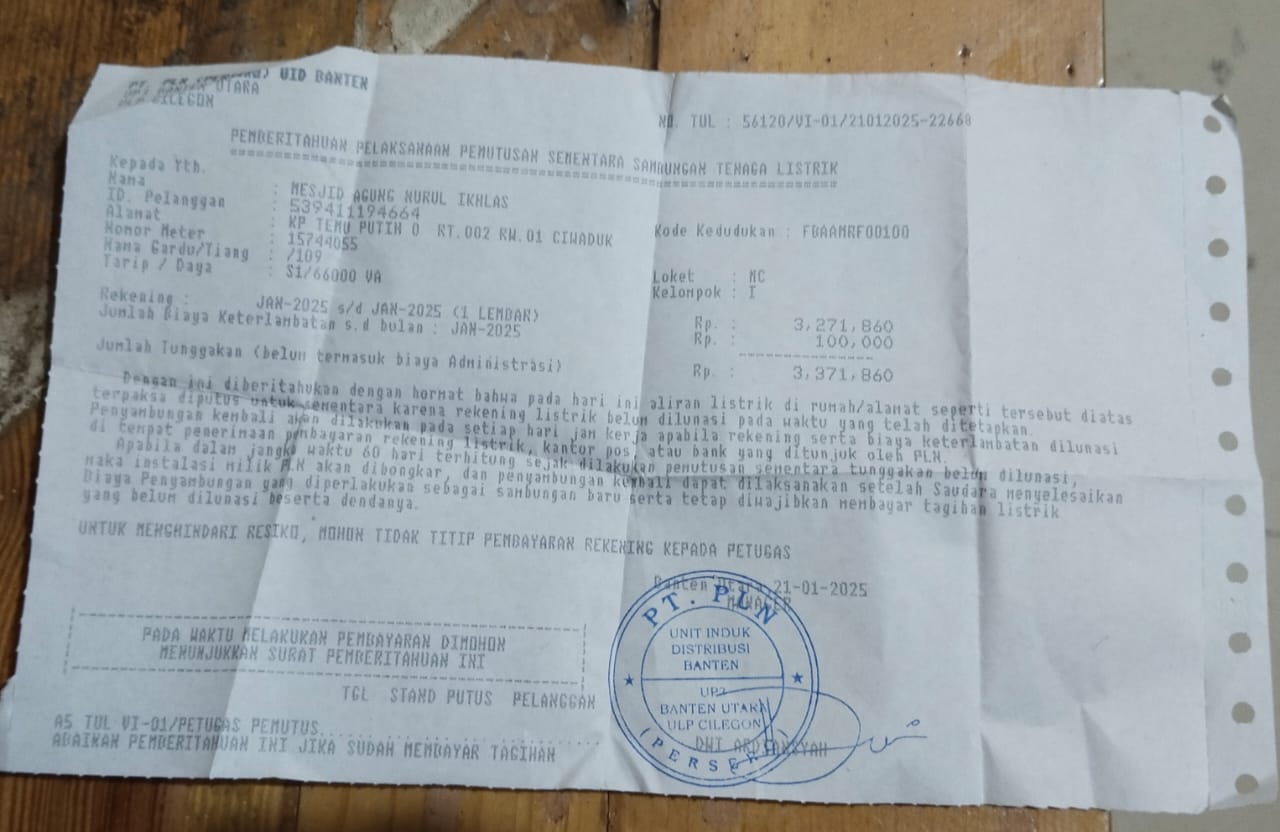 CILEGON, JURNALKUHP.COM – Masjid Agung Nurul Ikhlas Cilegon kini dalam kondisi memprihatinkan. Berbagai fasilitas di masjid kebanggaan masyarakat Cilegon ini rusak dan tidak terawat dengan baik. Mulai dari MCK dan tempat wudhu yang sangat memprihatinkan, hingga kebocoran pada kubah masjid yang memerlukan perbaikan segera. Belum lagi, masalah terkini berupa pemutusan aliran listrik oleh pihak PLN yang sudah berlangsung dua hari, semakin memperburuk keadaan masjid yang merupakan pusat ibadah utama di kota ini.