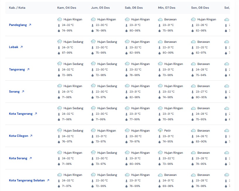 “BMKG telah memperbarui prakiraan cuaca untuk wilayah Provinsi Banten. Pagi hari diprakirakan didominasi cuaca berawan, dengan hujan ringan di sejumlah kecamatan seperti Cilegon, Pulomerak, Kramatwatu, Bojonegara, Ciomas, Padarincang, serta beberapa wilayah di Pandeglang, Lebak, dan Tangerang. Memasuki siang hari, potensi hujan meningkat dengan adanya hujan lebat di wilayah seperti Jiput, Mandalawangi, Kaduhejo, Pandeglang, hingga Carita. Sementara itu, hujan sedang diprediksi terjadi di sebagian besar Kabupaten Serang, Kota Serang, Cilegon, serta wilayah Tangerang Raya,” jelas Meryadi.