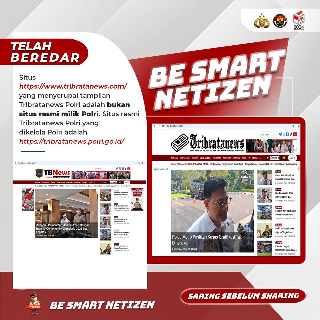 “Polri menegaskan bahwa satu-satunya situs resmi Tribratanews Polri adalah https://tribratanews.polri.go.id/. Segala informasi yang beredar di situs palsu tersebut tidak dapat dipertanggungjawabkan kebenarannya dan bukan berasal dari institusi Polri,” demikian pernyataan Humas Polri.