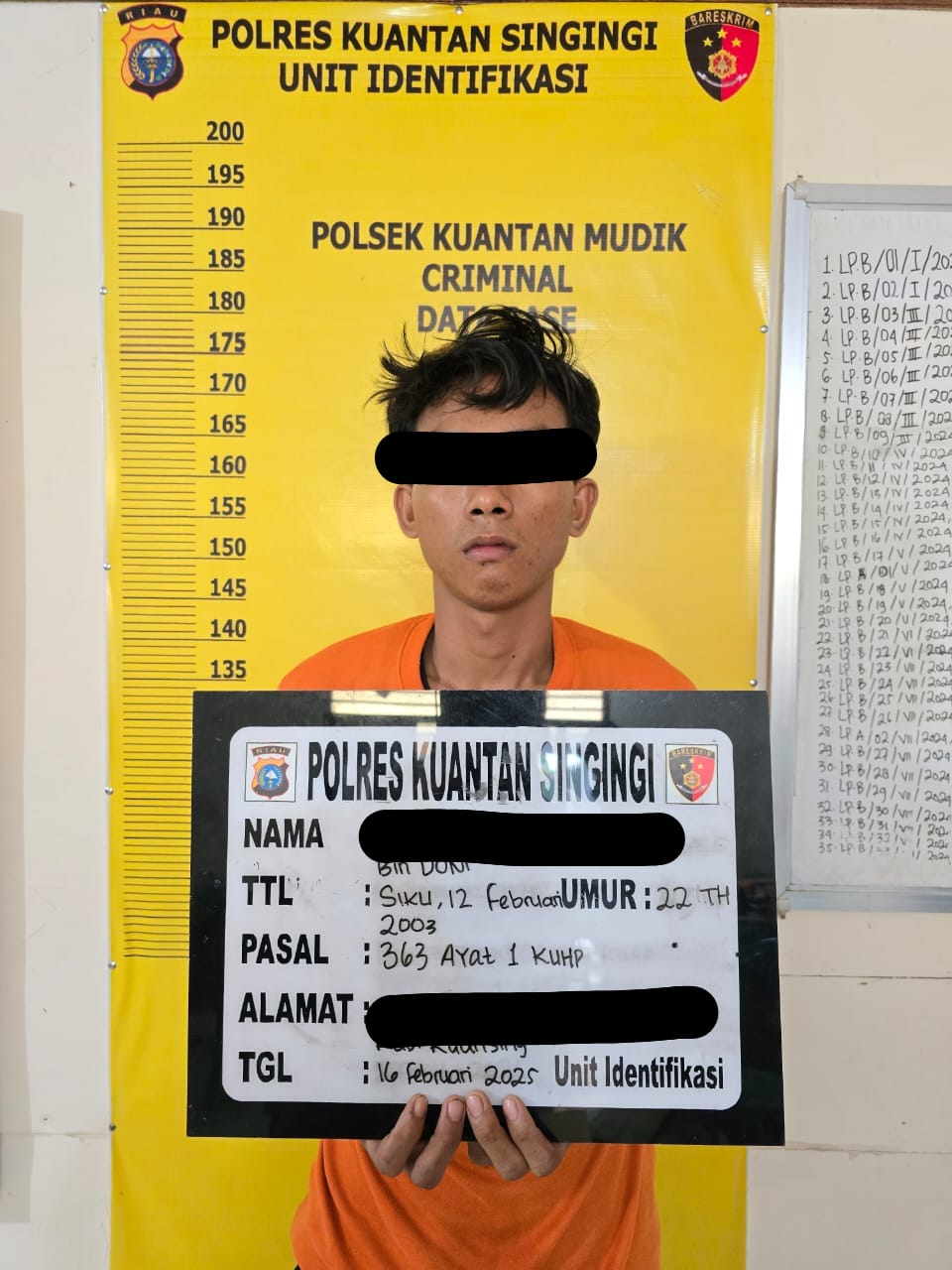 KUANTANSINGINGI,jurnalkuhp.com– Kepolisian Sektor (Polsek) Kuantan Mudik berhasil mengungkap kasus pencurian dengan pemberatan yang terjadi di sebuah warung grosir milik saudara Y di Desa Gunung, Kecamatan Gunung Toar, Kabupaten Kuansing. Pelaku yang berinisial R (22) berhasil diamankan pada Minggu (16/2/2025) sekira pukul 19.40 WIB setelah dilakukan penyelidikan oleh pihak kepolisian.