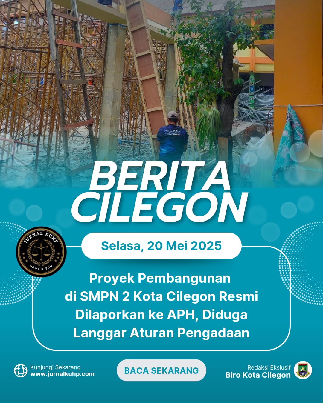 CILEGON, JURNALKUHP.COM – Proyek pembangunan yang tengah berlangsung di SMPN 2 Kota Cilegon resmi dilaporkan ke Aparat Penegak Hukum (APH) oleh salah satu Lembaga Swadaya Masyarakat (LSM) di Provinsi Banten, Selasa (20/5). Laporan tersebut didampingi langsung oleh kuasa hukum Moch. Mulyadi, SH, yang menyoroti sejumlah dugaan pelanggaran hukum dan indikasi penyimpangan dalam pelaksanaan proyek tersebut.