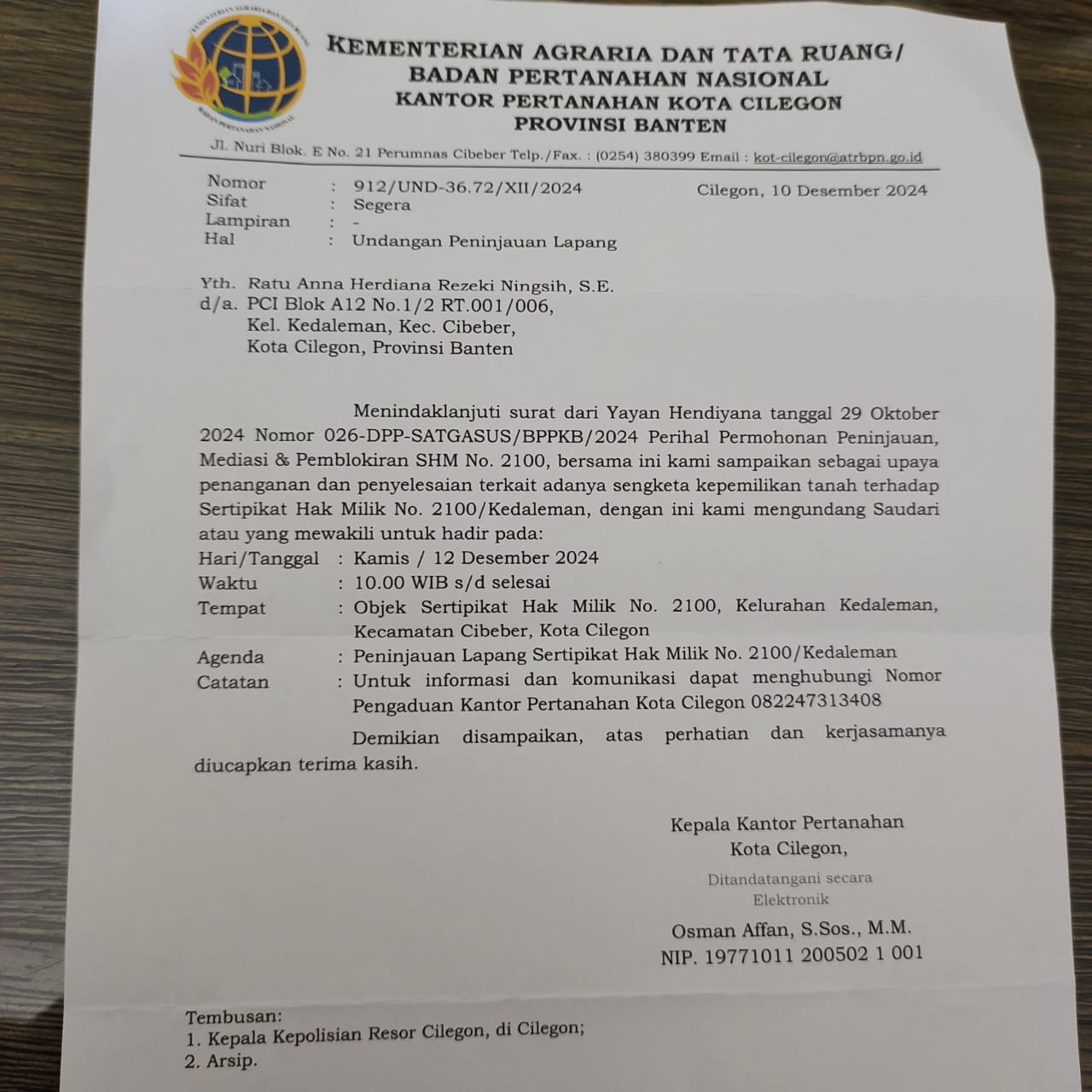 Sementara itu, hingga berita ini diturunkan, belum ada tanggapan resmi dari pihak BPN Kota Cilegon terkait ultimatum tersebut.