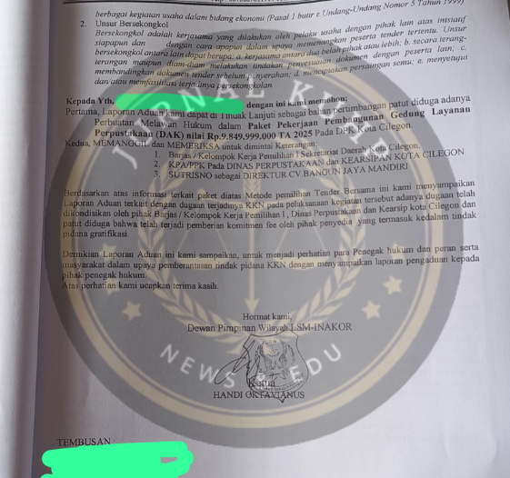 Redaksi JURNAL KUHP menilai laporan LSM INAKOR terkait dugaan KKN dalam proyek pembangunan Gedung Layanan Perpustakaan Kota Cilegon senilai Rp9,8 miliar merupakan isu serius yang menyangkut transparansi dan integritas pengelolaan anggaran publik. Fakta-fakta yang dipaparkan dalam laporan, mulai dari indikasi persekongkolan tender, dugaan pemalsuan dokumen, hingga pengalaman kerja fiktif, perlu ditelusuri lebih lanjut oleh Aparat Penegak Hukum (APH).