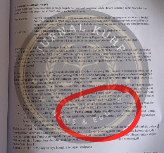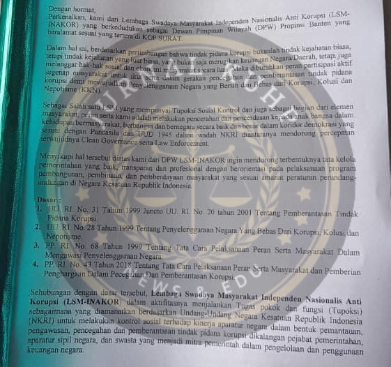 INAKOR sudah melayangkan Somasi Nomor 60/Inakor/VII/2025 ke Dinas Perpustakaan dan Kearsipan Kota Cilegon. Somasi itu diterima secara resmi, namun hingga kini tidak ada jawaban dari pihak dinas maupun panitia pengadaan.