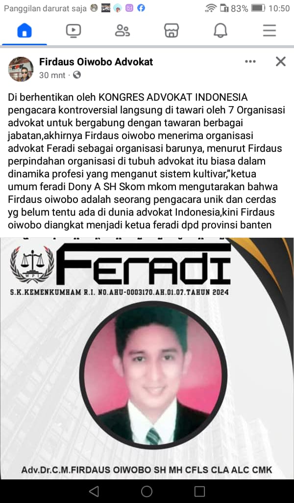 “Akhirnya Firdaus Oiwobo menerima organisasi advokat Feradi Wpi sebagai organisasi barunya,” lanjut Firdaus dengan penuh semangat.