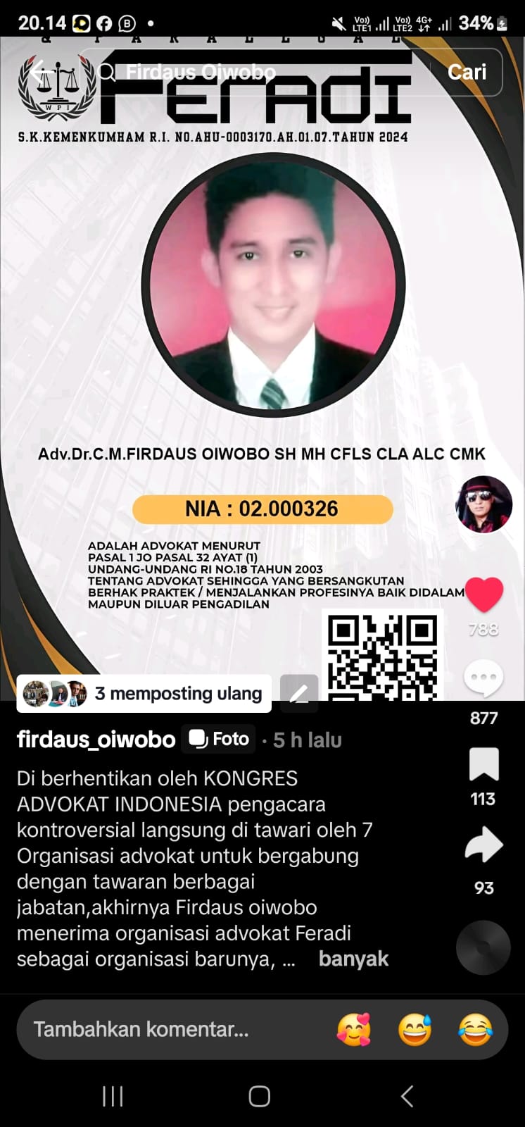 “Diberhentikan oleh Kongres Advokat Indonesia, pengacara kontroversial langsung ditawari oleh tujuh organisasi advokat untuk bergabung dengan tawaran berbagai jabatan,” tulis Firdaus sebagai pembuka di Tiktok Beliau