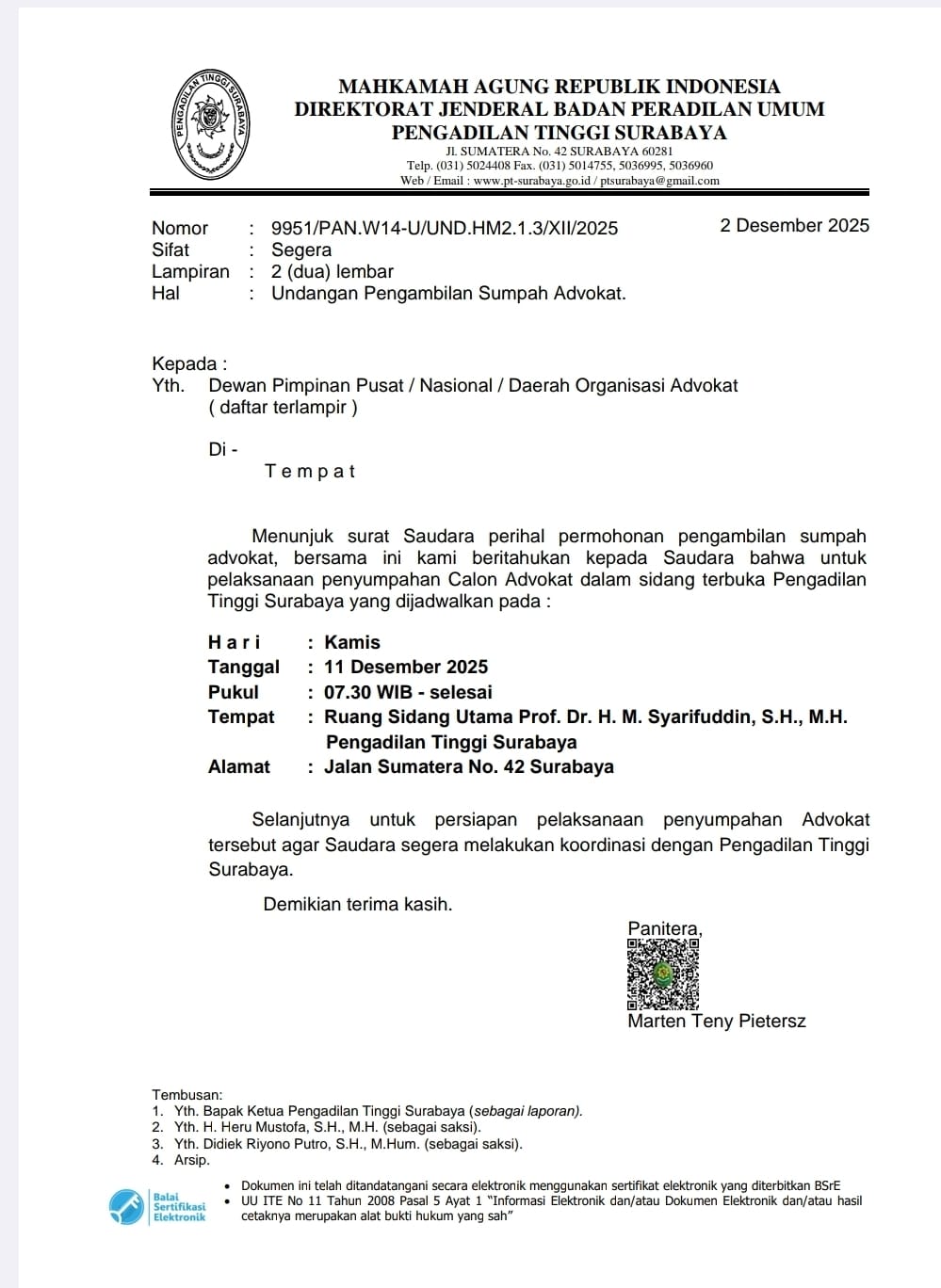 Sebagai aksi nyata maka Penyumpahan Advokat FERADI WPI di Pengadilan Tinggi Surabaya yang akan dilaksanakan pada tanggal 11 Desember 2025 ini benar benar GRATIS. alias beasiswa penuh.