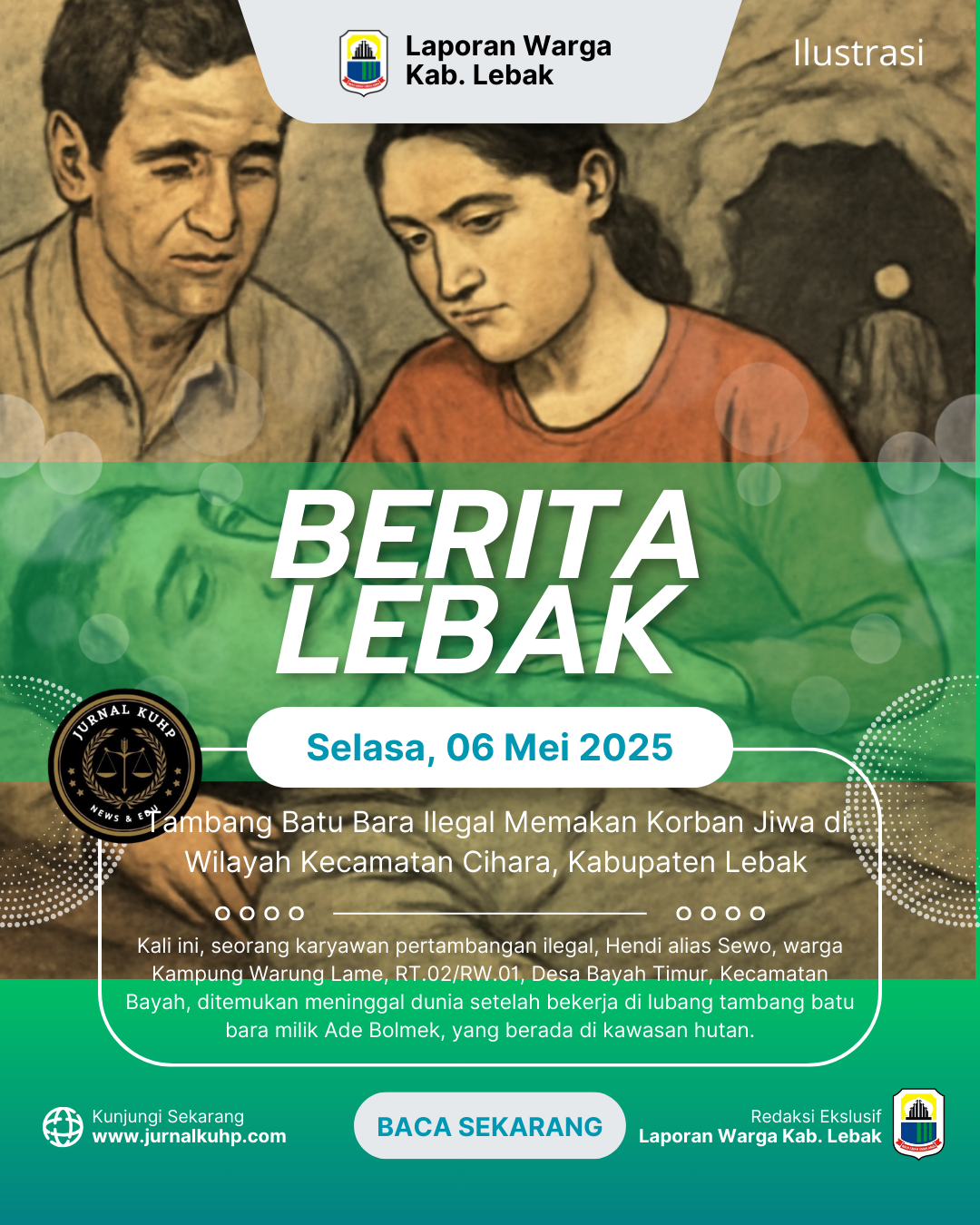 LEBAK, JURNALKUHP.COM — Kecelakaan kerja kembali terjadi di wilayah pertambangan batu bara ilegal di Blok RPH Panjaungan Timur, Kecamatan Cihara, Kabupaten Lebak, Provinsi Banten, pada Selasa (6/5/2025). Kali ini, seorang karyawan pertambangan ilegal, Hendi alias Sewo, warga Kampung Warung Lame, RT.02/RW.01, Desa Bayah Timur, Kecamatan Bayah, ditemukan meninggal dunia setelah bekerja di lubang tambang batu bara milik Ade Bolmek, yang berada di kawasan hutan.