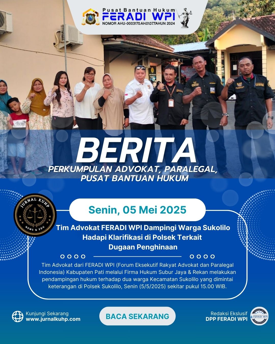 PATI, JURNALKUHP.COM — Tim Advokat dari FERADI WPI (Forum Eksekutif Rakyat Advokat dan Paralegal Indonesia) Kabupaten Pati melalui Firma Hukum Subur Jaya & Rekan melakukan pendampingan hukum terhadap dua warga Kecamatan Sukolilo yang dimintai keterangan di Polsek Sukolilo, Senin (5/5/2025) sekitar pukul 15.00 WIB.