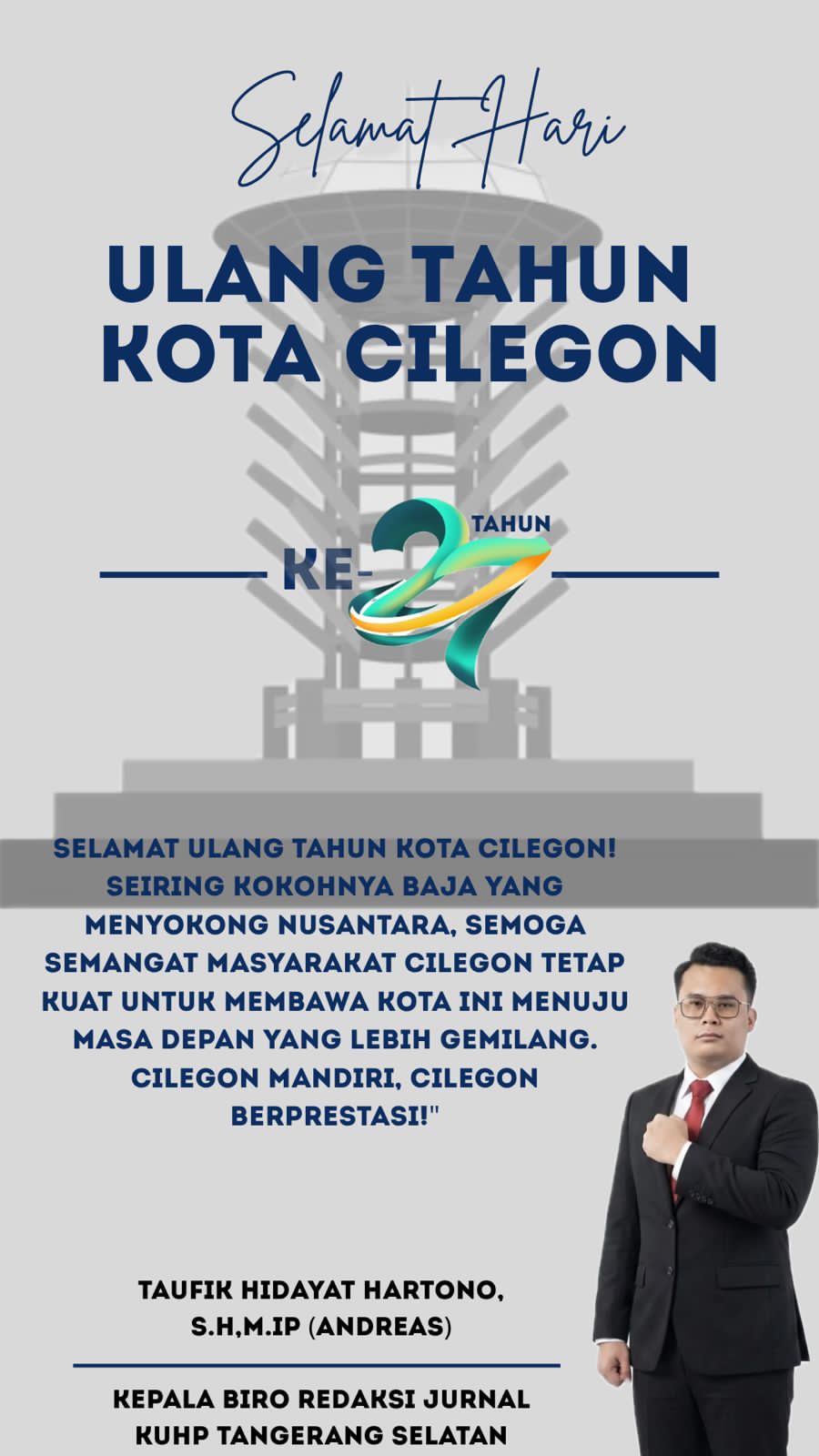 CILEGON, JURNALKUHP.COM – Momentum peringatan Hari Ulang Tahun (HUT) ke-27 Kota Cilegon pada 27 April 2026 terus mendapatkan perhatian dan apresiasi dari berbagai kalangan. Salah satunya datang dari Kepala Biro Redaksi Jurnal KUHP Tangerang Selatan, Taufik Hidayat Hartono, S.H., M.IP (Andreas), yang menyampaikan ucapan sekaligus harapan bagi kemajuan kota industri tersebut.