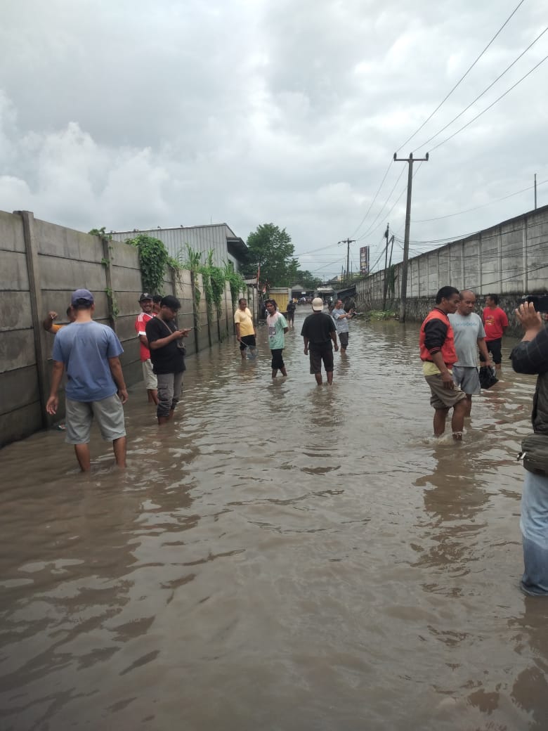 Dulu sebelum adanya pabrik baja dan gudang besi jalan ini tidak tergenang air seperti ini. Setelah ada bangunan pabrik dan gudang, air tidak mengalir. Bahkan dari dalam gudang ada gorong-gorong pembuangan air keluar. Ucap Ujang.
